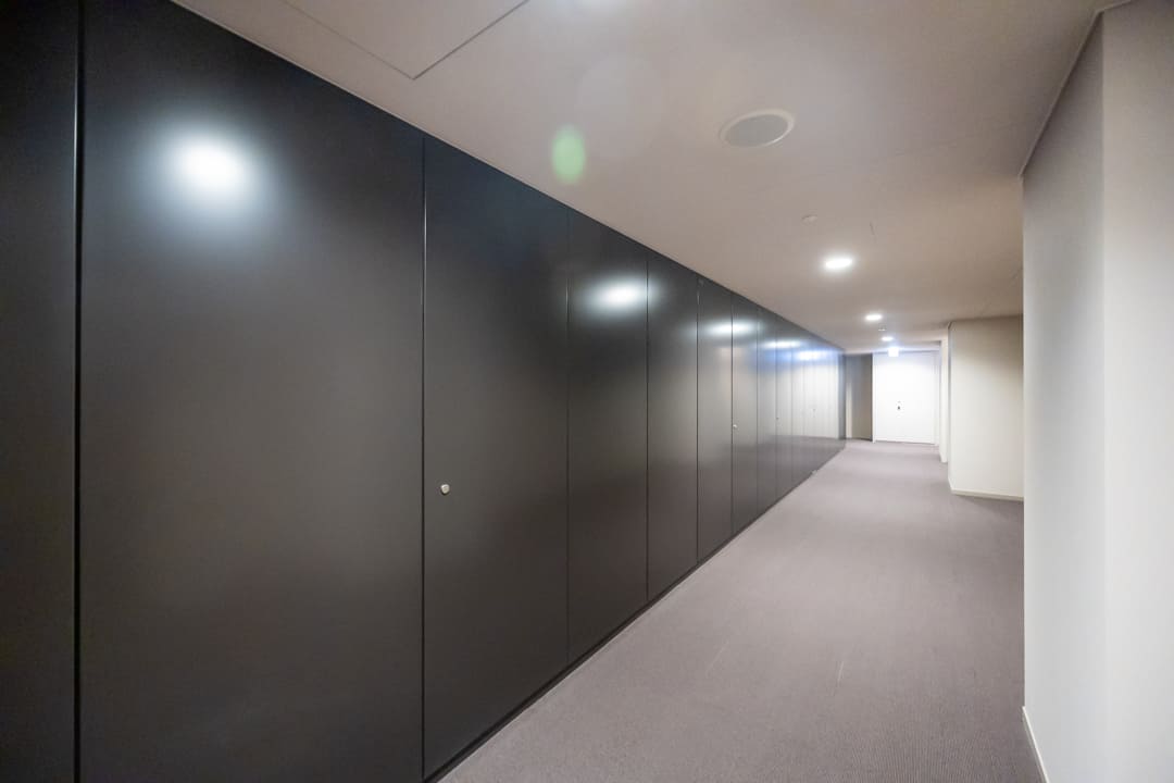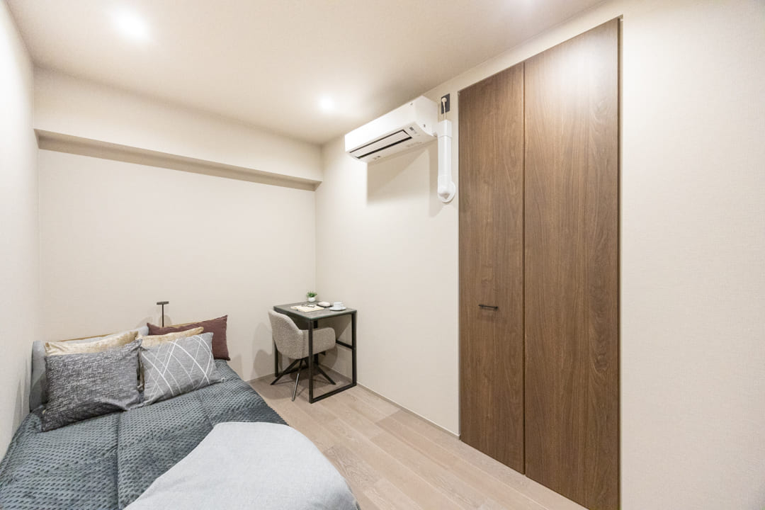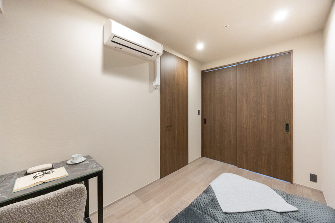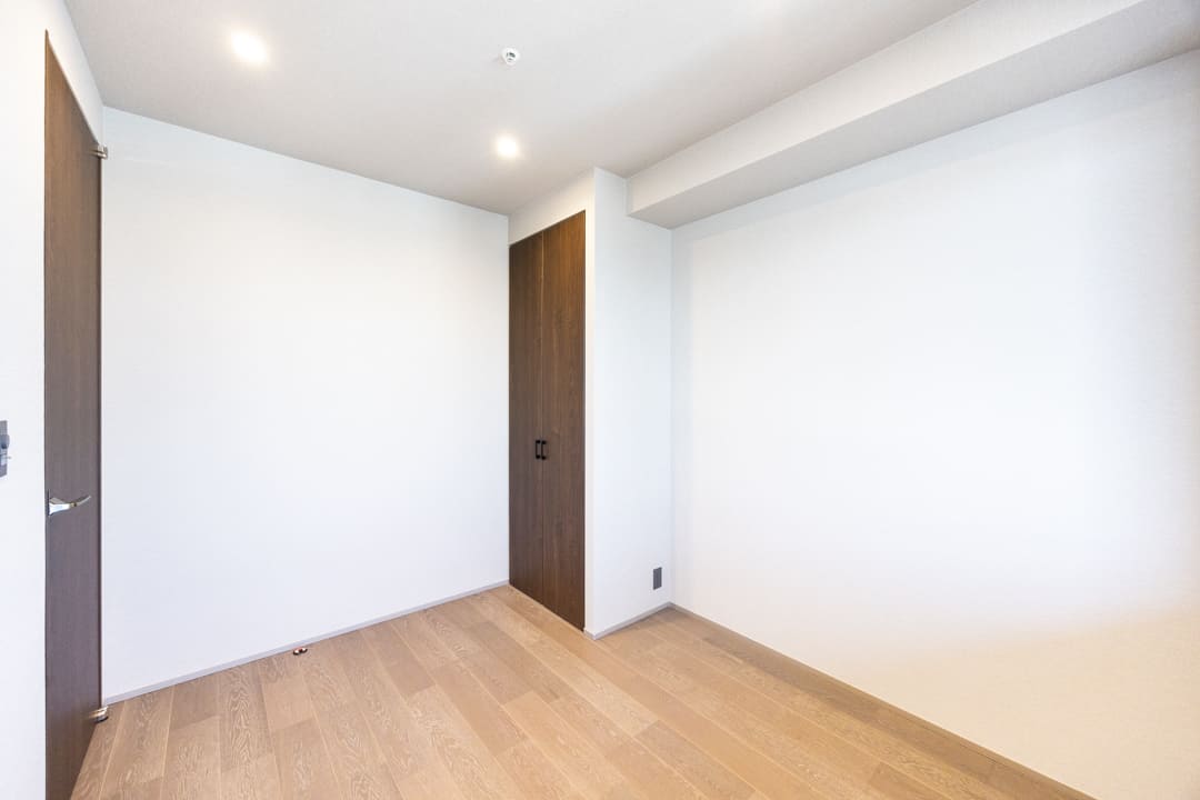 約4.7帖の寝室2。LDKに隣接し、引き戸で仕切られた空間です。扉を閉めればほど良い独立感があり、ワークスペースや趣味部屋としても使いやすい一室。クローゼットを備え、収納面もきちんと確保されています。扉を開けることでLDKとのつながりを感じられ、ほど良い距離感が保たれています。