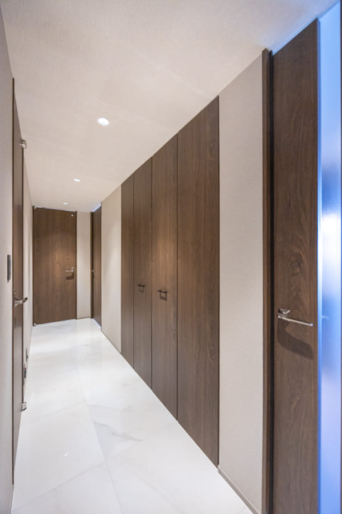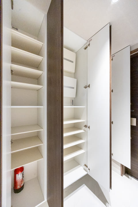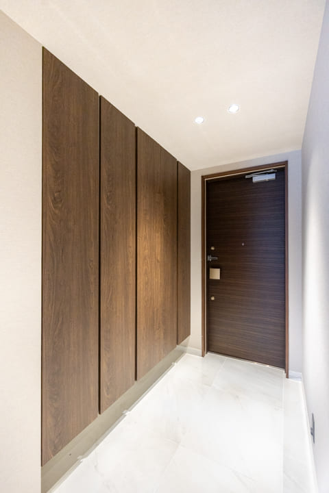 大理石調フロアで高級感の漂う玄関ホール。トールタイプのシューズボックスを備え、収納性に優れています。自由度の高い可動棚なので、ロングブーツやレインシューズもすっきり収納可能。廊下にも物入があり、日用品ストックやペットグッズの収納に重宝しそうです。