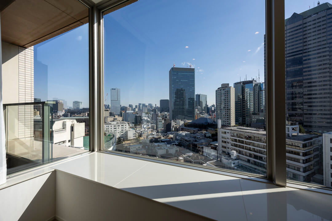洋室1に面した約5.92㎡のバルコニー。朝の光が心地よい東向きです。バルコニー手すり部分が透明になっているので開放的。目の前には都心のビル群が広がっています。陽が落ちれば夜景も楽しめそうですね。