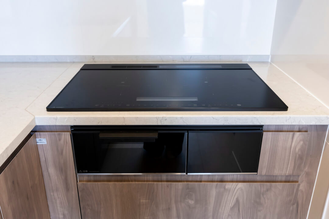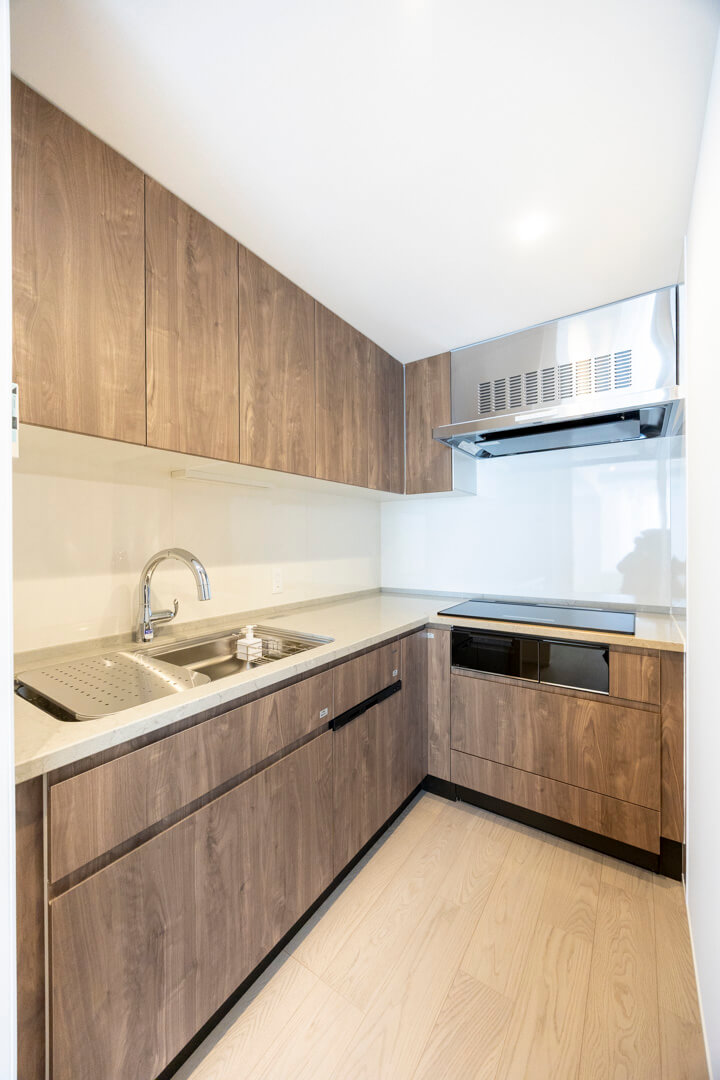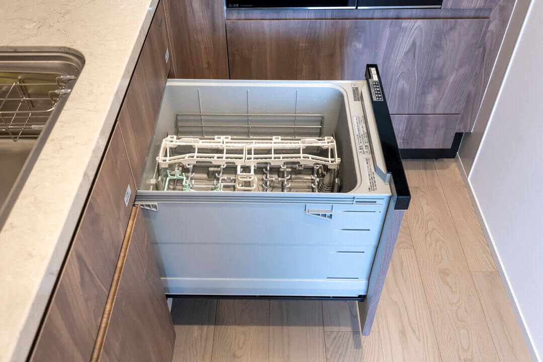 リビングダイニングと空間分けされたキッチンスペース。キッチンまわりの生活感をさりげなく目隠しできます。作業スペースが広々使えるL字型のシステムキッチン。手入れが楽なIHクッキングヒーター、家事の時短に心強い食洗機、生ゴミの処理に便利なディスポーザー付きで設備も充実しています。また、カップボードも設置されていて、収納スペースもしっかりと確保されています。
