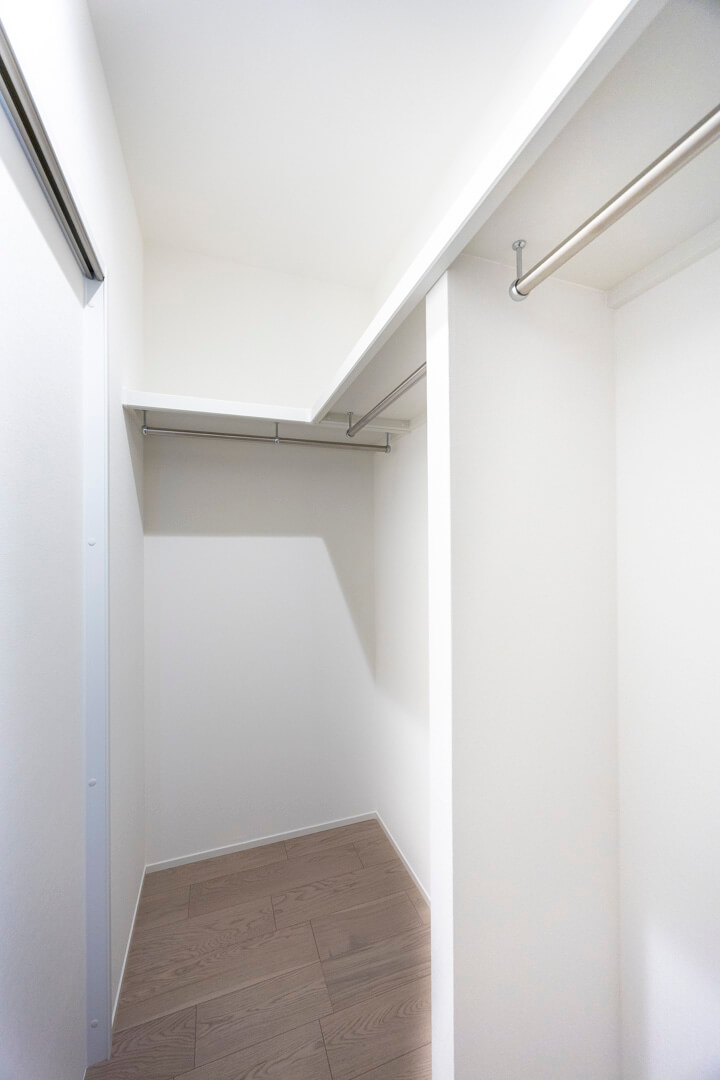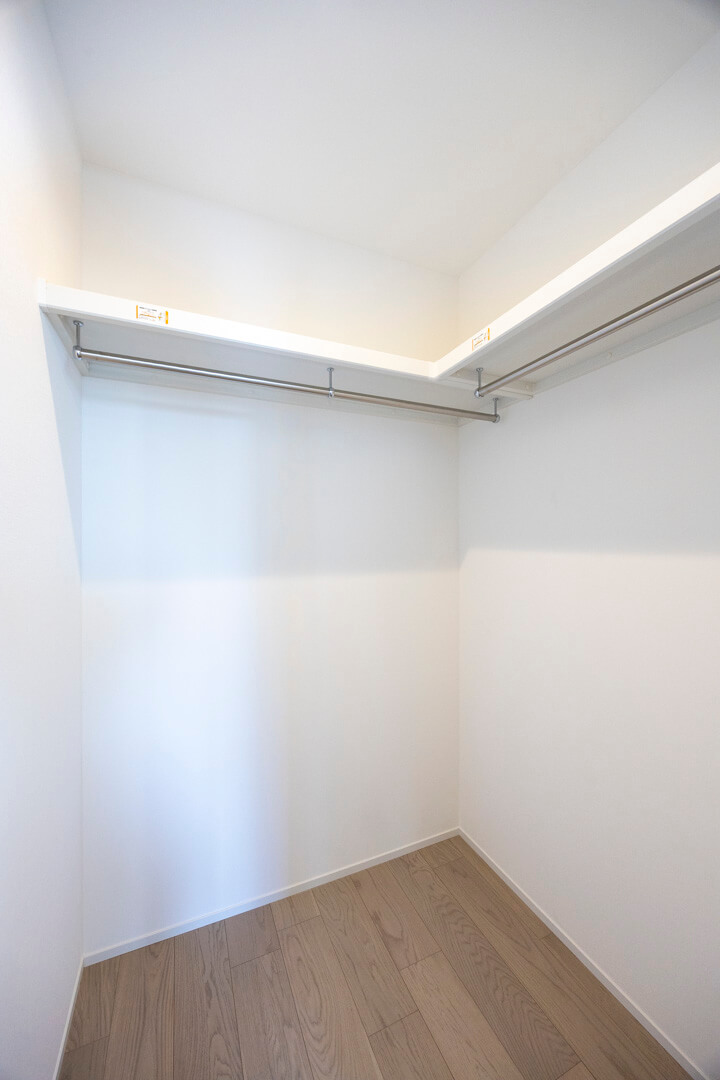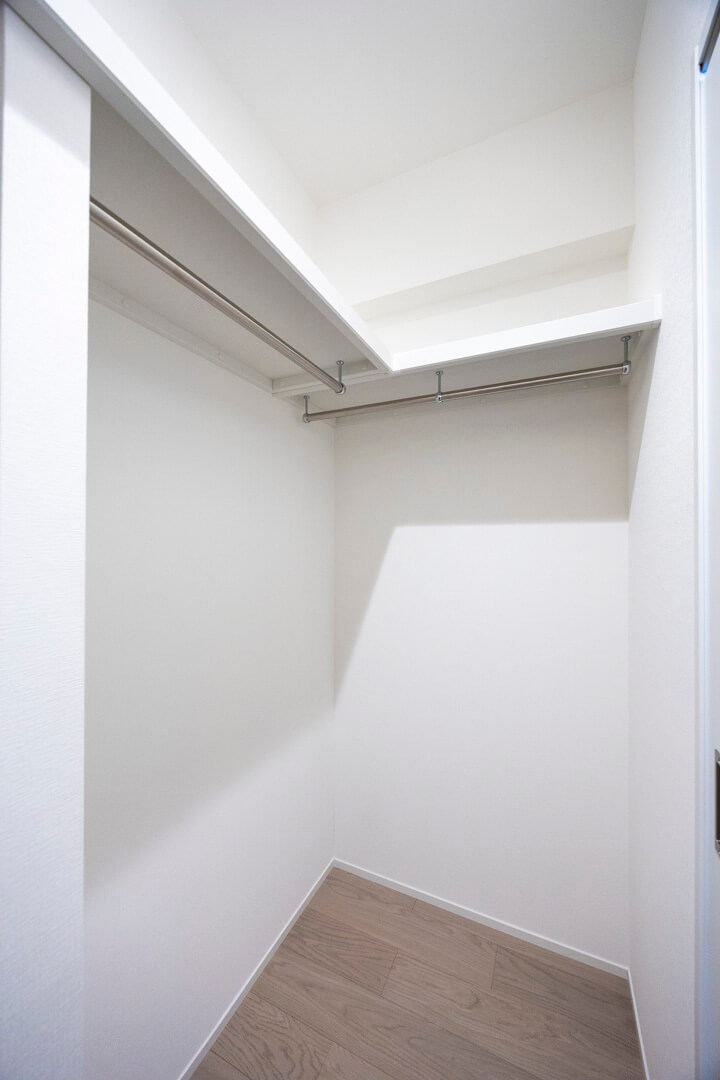 リビングと隣接した約6.2帖の洋室2。こちらも朝の光が心地よい東向きで、眺望も良好です。扉の開口部が広くとられており、リビングと繋げてより広々と過ごせます。床にドアレールがないので見た目もすっきりとした印象です。3方向にハンガーパイプがついたWIC(ウォークインクローゼット)も備わっています。