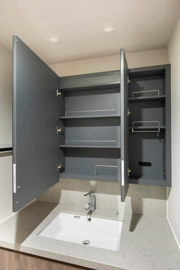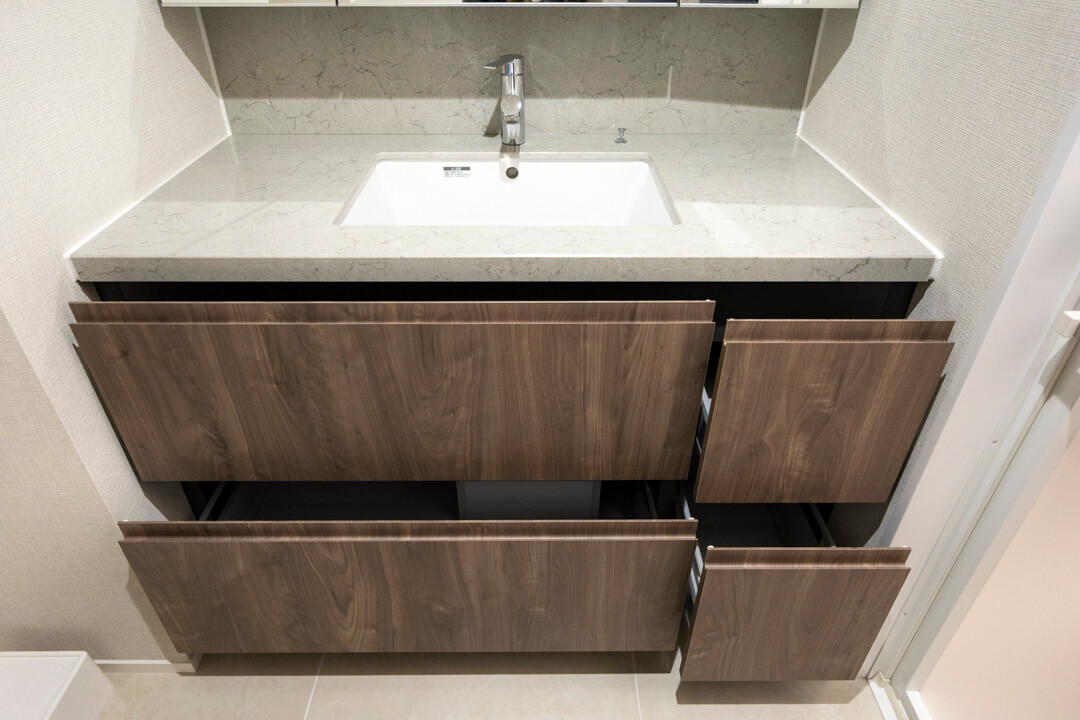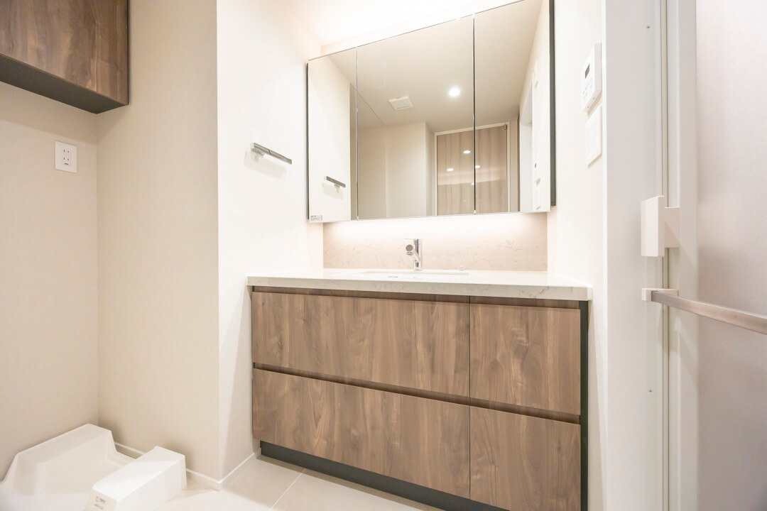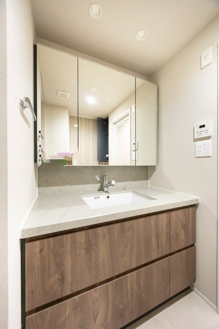 洗面化粧台は洗面まわりの小物がすっきり整頓できるミラーボックスや、モノの出し入れがしやすい引き出し式のキャビネット付きで使い勝手の良さがポイント。別途、リネン庫も設けられていて収納スペースが充実しています。