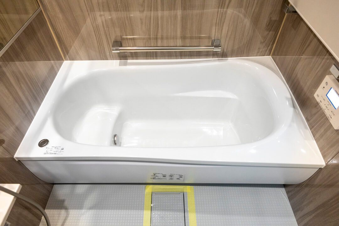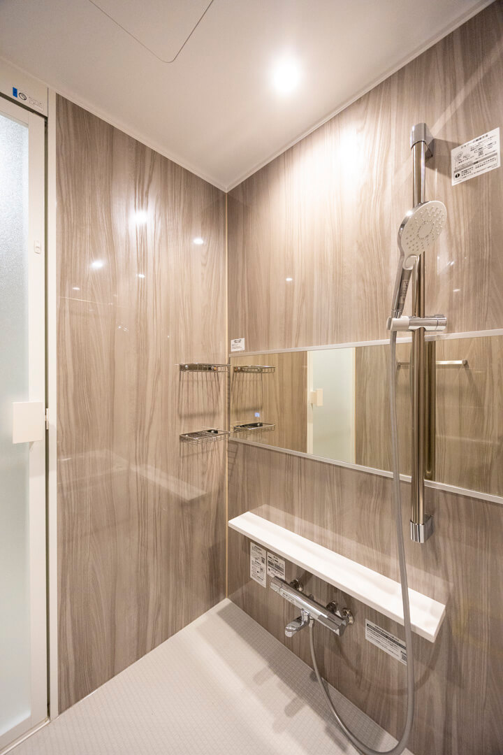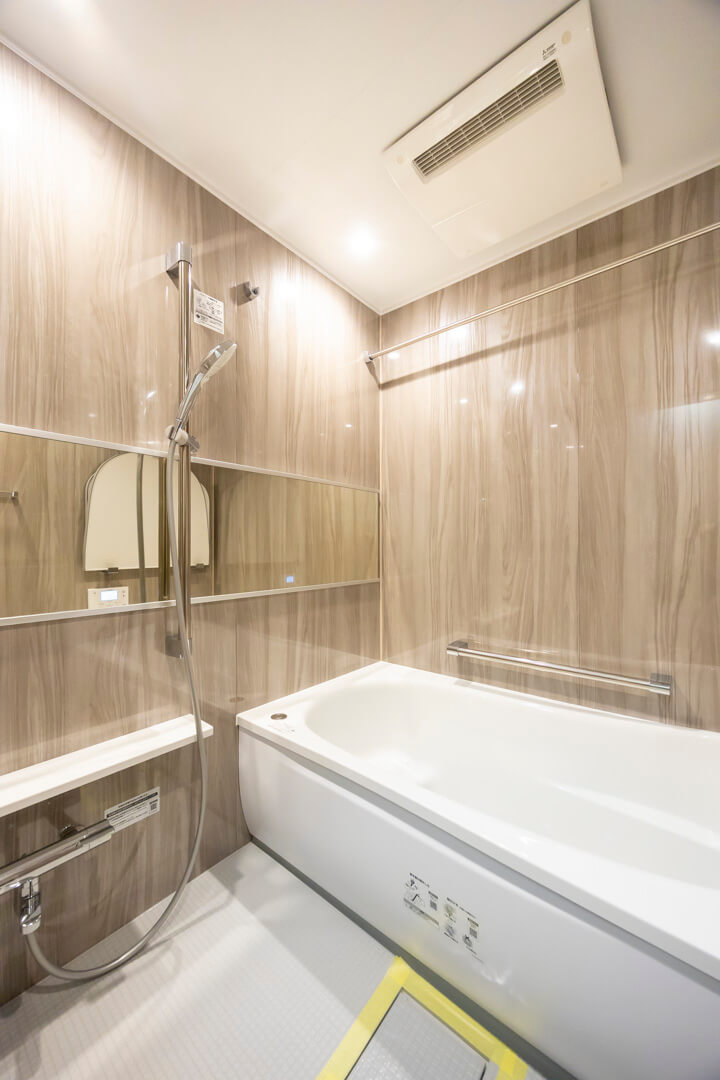 ウッド調であたたかみのある雰囲気のバスルーム。1418サイズです。追い炊き機能の他、乾燥・換気・暖房・涼風の4つの機能が備わっていて一年中快適にバスタイムが楽しめます。ランドリーパイプ付きで雨の日や冬場の洗濯にも困りません。