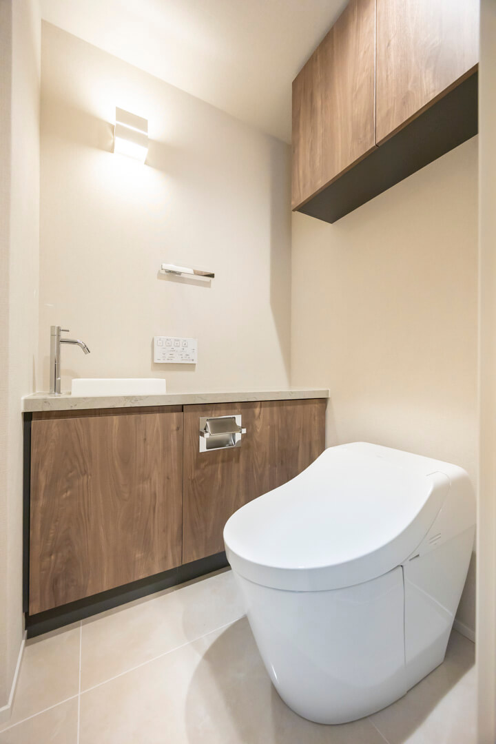 廊下に面したレストルーム。空間がすっきり見えるタンクレストイレです。手洗いカウンター、ウォシュレット、収納スペースも備わっています。