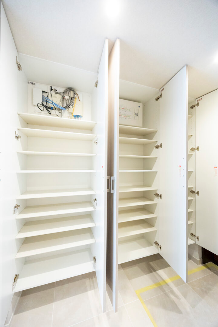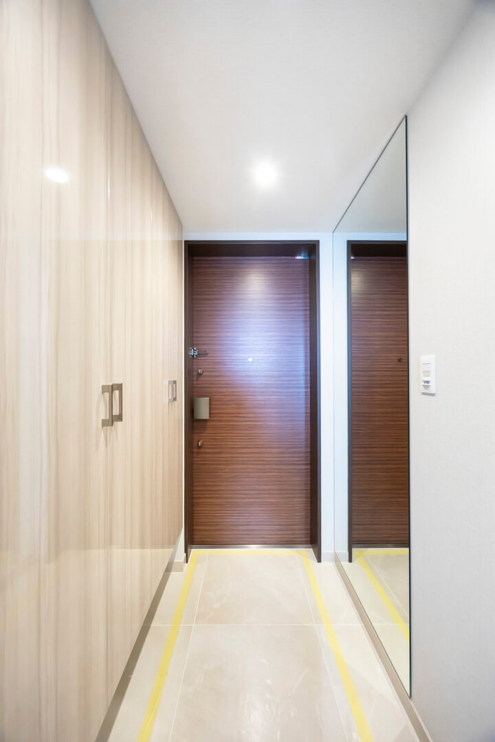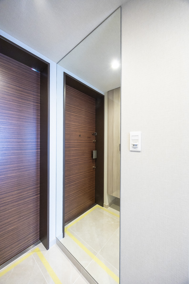 玄関には天井まで高さのあるシューズボックスを完備。4枚扉で靴がたっぷりと収納できます。また、シューズボックスの対面側には姿見も設置されていて、お出かけ前の身だしなみチェックに便利です。