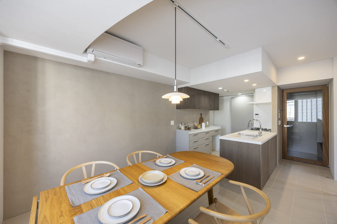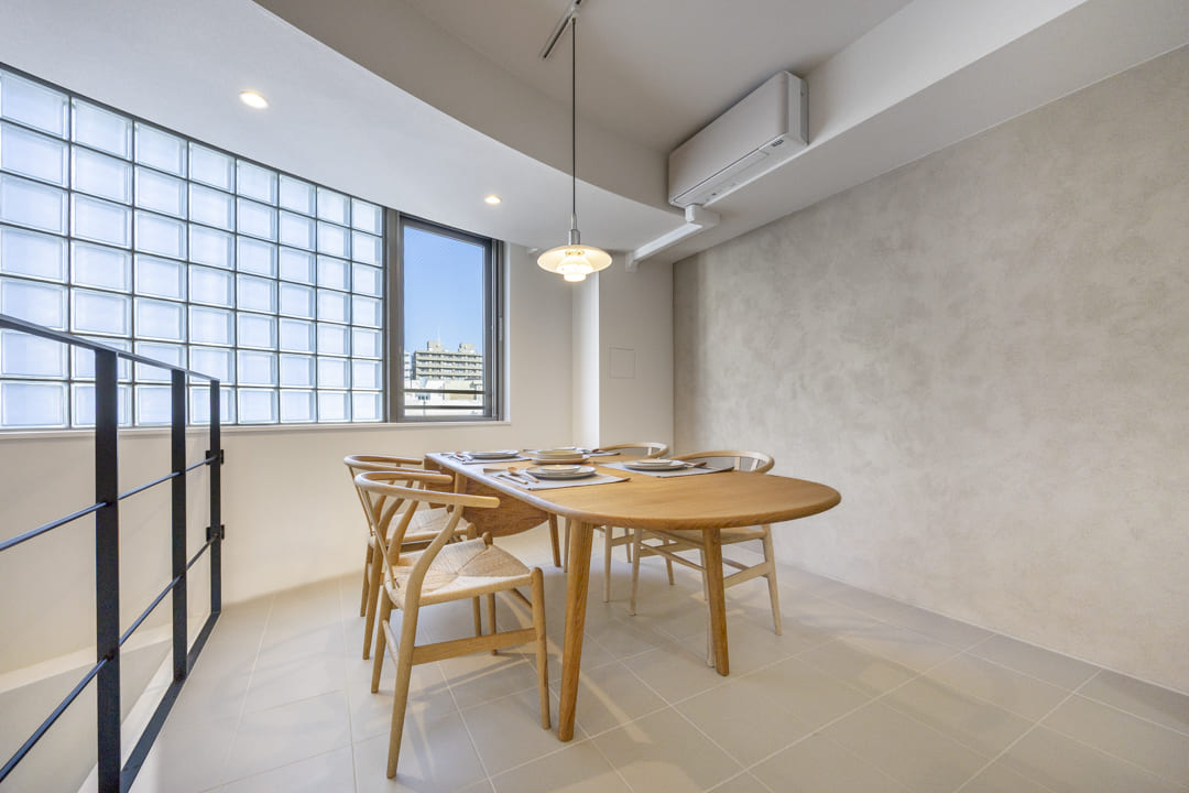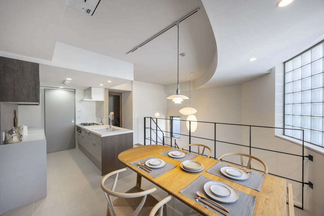 約11.7帖のキッチンダイニングです。グレートーンでまとめられた上質感のある空間。吹き抜けと、柔らかな曲線を描く天井デザインが印象的。一般的なフラット天井にはない立体感があり、視線が抜けることで実際以上に広さを感じられます。外光を柔らかく取り込むガラスブロック窓が、空間に開放感と明るさをプラス。