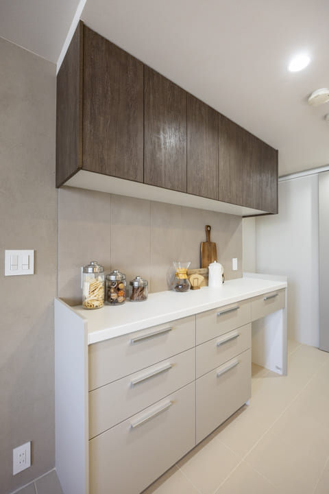 キッチンの背面側にはカップボードが備え付けられています。調味料や食器などを収納できるだけでなく、電子レンジなどを置くこともできるので便利です。