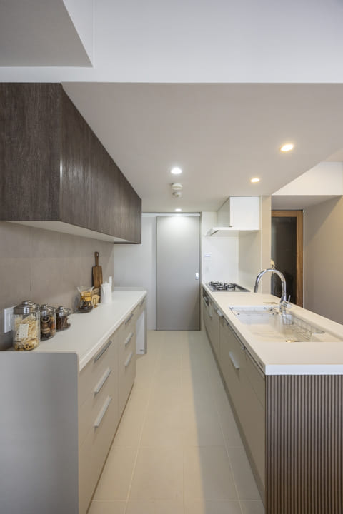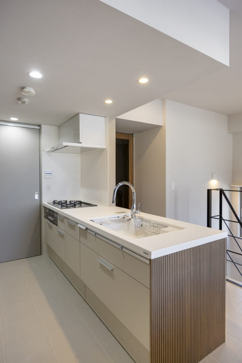 キッチンは、家族や来客とのコミュニケーションが取りやすい対面式です。食事の配膳もしやすくて◎。また、廊下から直接アクセスができるのも嬉しいポイントです。