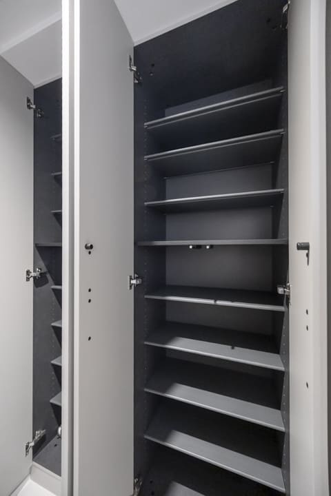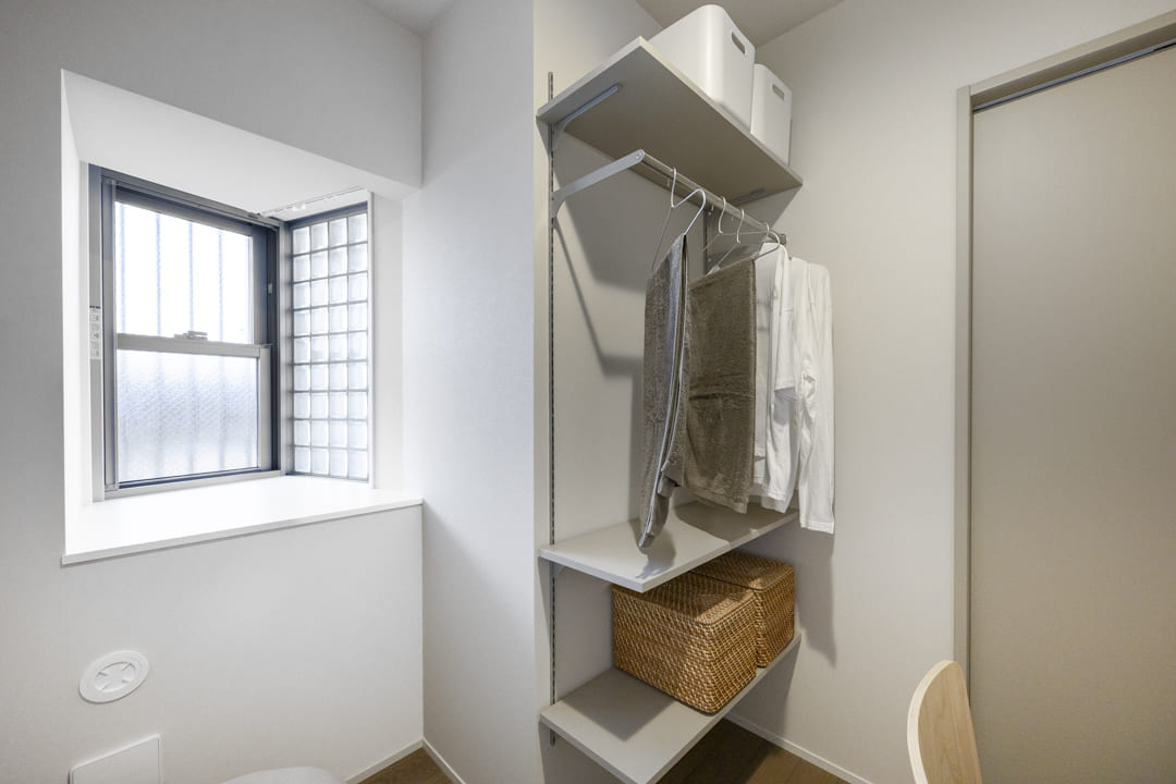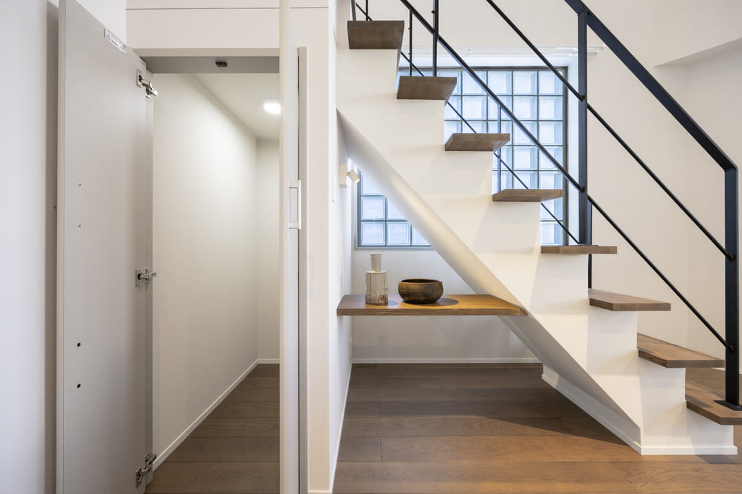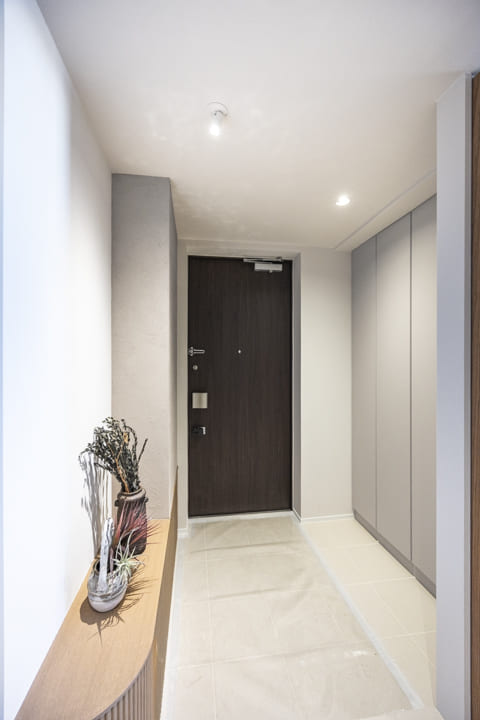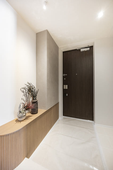 玄関には高さのあるシューズボックスが備え付けられています。中には可動棚が設置されているので、持っている靴に合わせて調節ができますよ。反対側に造られている丸みのあるカウンターにはお気に入りの小物を飾っても◎。