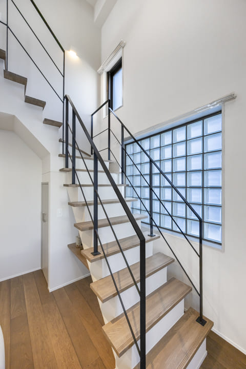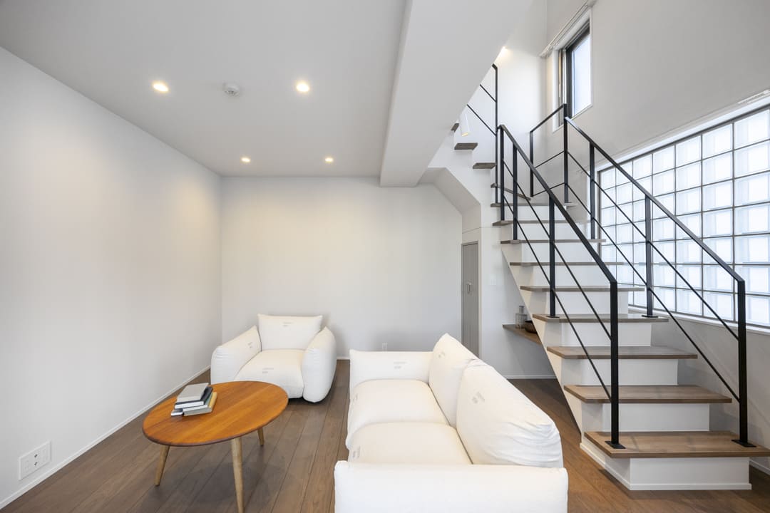 内階段を降りると約13.8帖のリビングがあります。ゆったりと過ごせる空間で、床暖房も設置されています。階段下は収納スペースとして使って、デッドスペースを有効活用していますよ。インターホンがあるので、来客対応も可能です。また、バルコニーが付いており、ちょっとした気分転換にも◎。