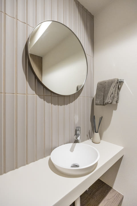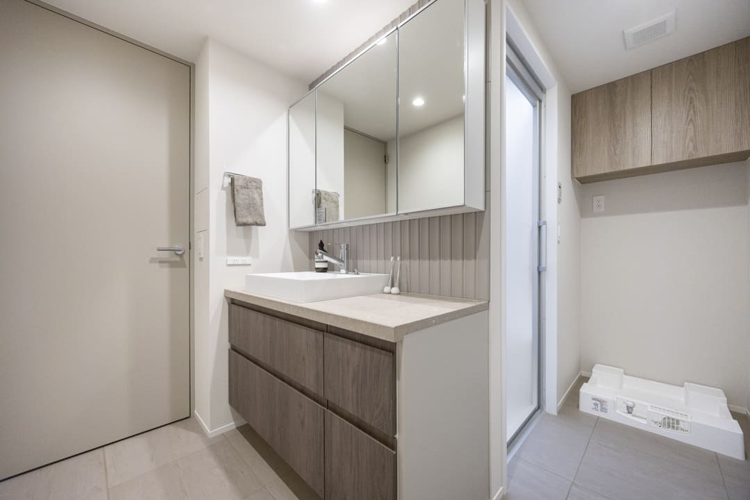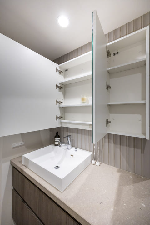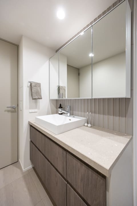 置き型式の洗面ボウルがおしゃれな洗面化粧台です。カウンターにはスペースがあるので、身支度もしやすそう。また、三面鏡の中には化粧品などが収納できて使い勝手が良好です。