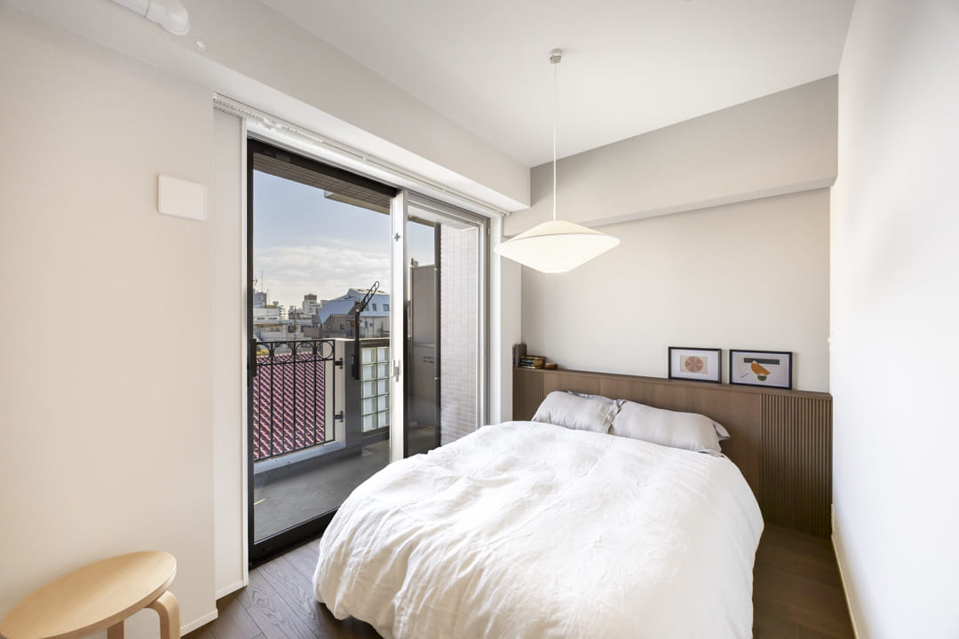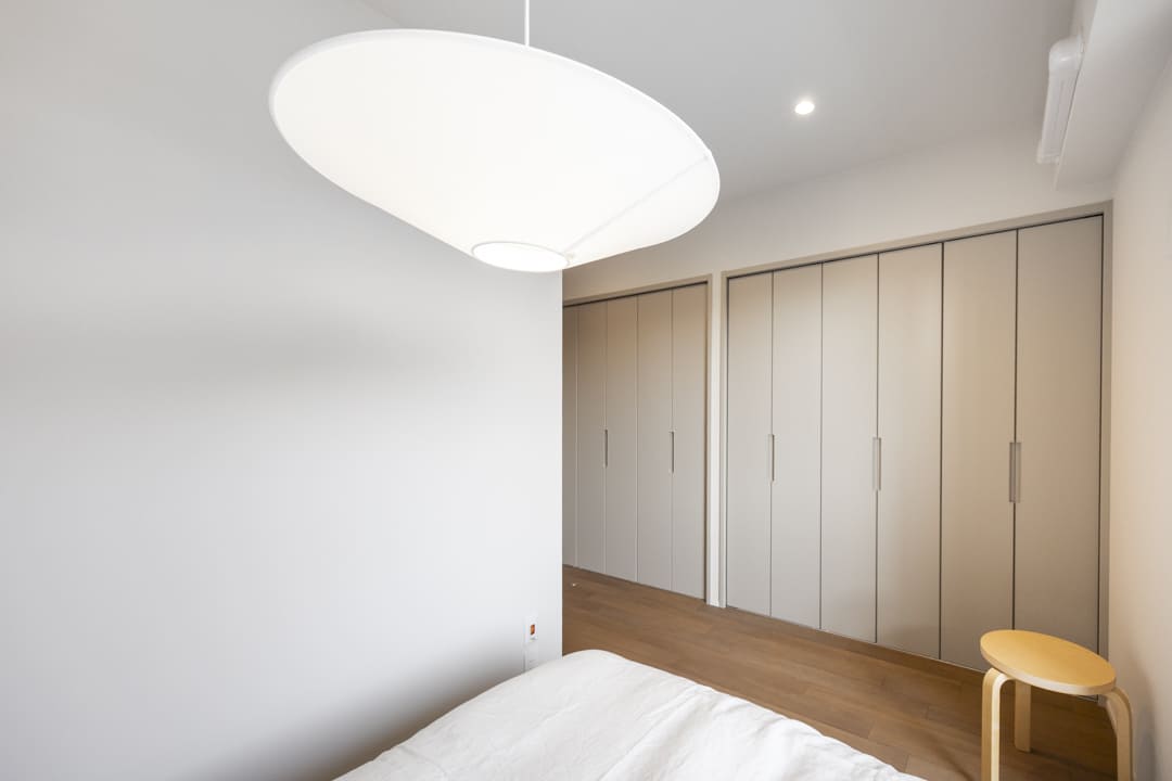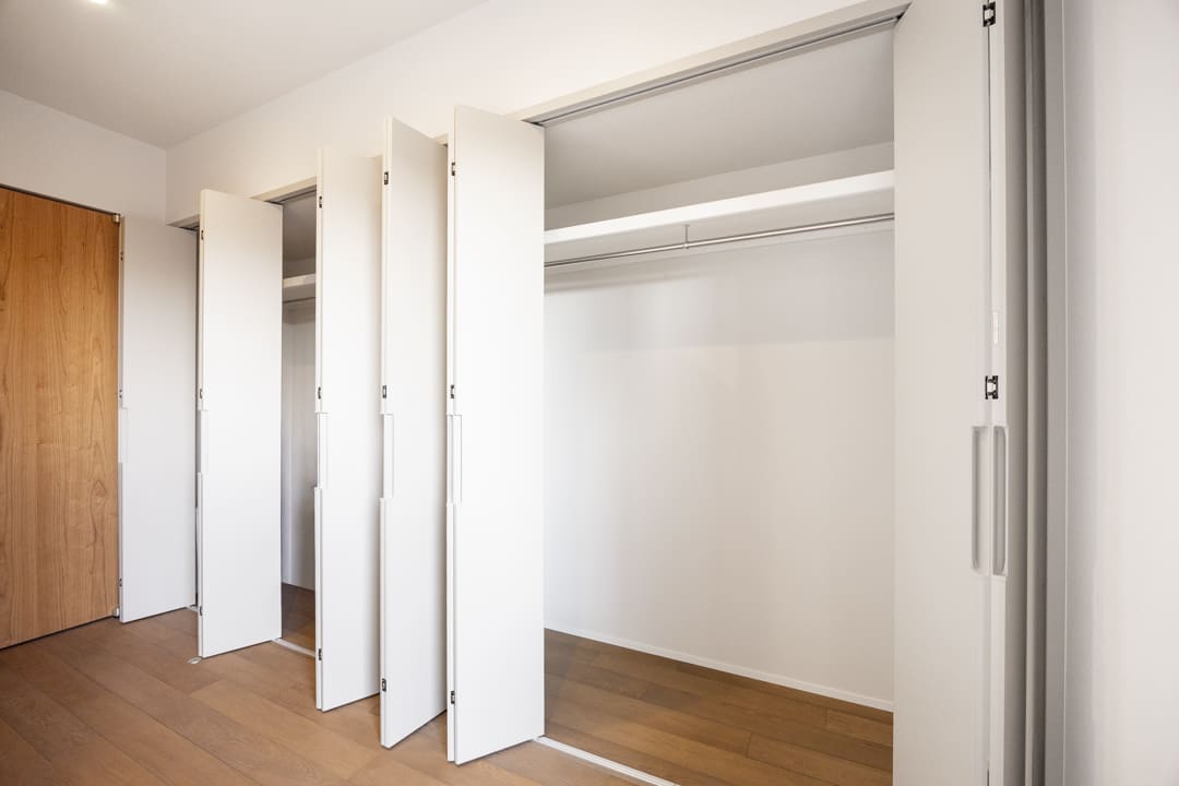 約6.4帖の洋室1は主寝室に良さそうなお部屋です。木目柄の造作ヘッドボードは本や小物、アートをさりげなく置けて、ホテルライクな雰囲気を演出してくれます。また、間接照明が、壁面をふんわりと照らし、リラックス感のある光環境に。さらに、大容量のクローゼットも造られています。洋服も大きめの荷物も収納できて便利ですね。