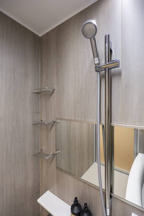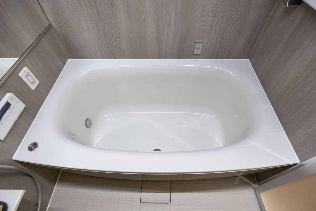 ブラウンの壁パネルが落ち着いた雰囲気を演出してくれている浴室です。照明には調光機能が付いているので、その日の気分に合わせて浴室の雰囲気を変えることができます。また、お風呂にゆっくり浸かるのが好きという方に嬉しい追い焚き機能を搭載。家族の入浴時間がずれてしまっても安心です。浴室乾燥機には暖房・乾燥・換気・涼風の機能がついており、一年中快適に過ごすことができますよ。