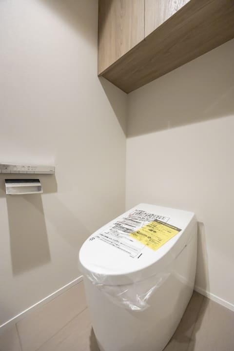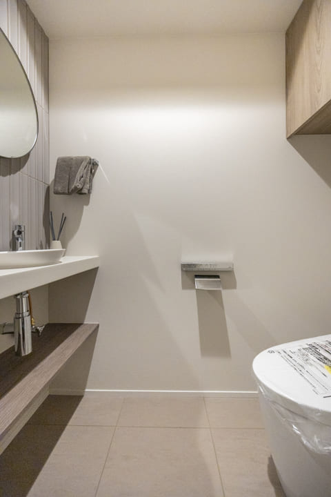 ウォシュレット一体型のトイレです。タンクレスタイプなのですっきりとした印象に。また、別途で手洗い器と鏡が造られているので、その場でサッと身だしなみを整えることができます。上部には吊戸棚が設置されていて、収納スペースもありますよ。カウンタースペースにはアロマなどを置いても◎。