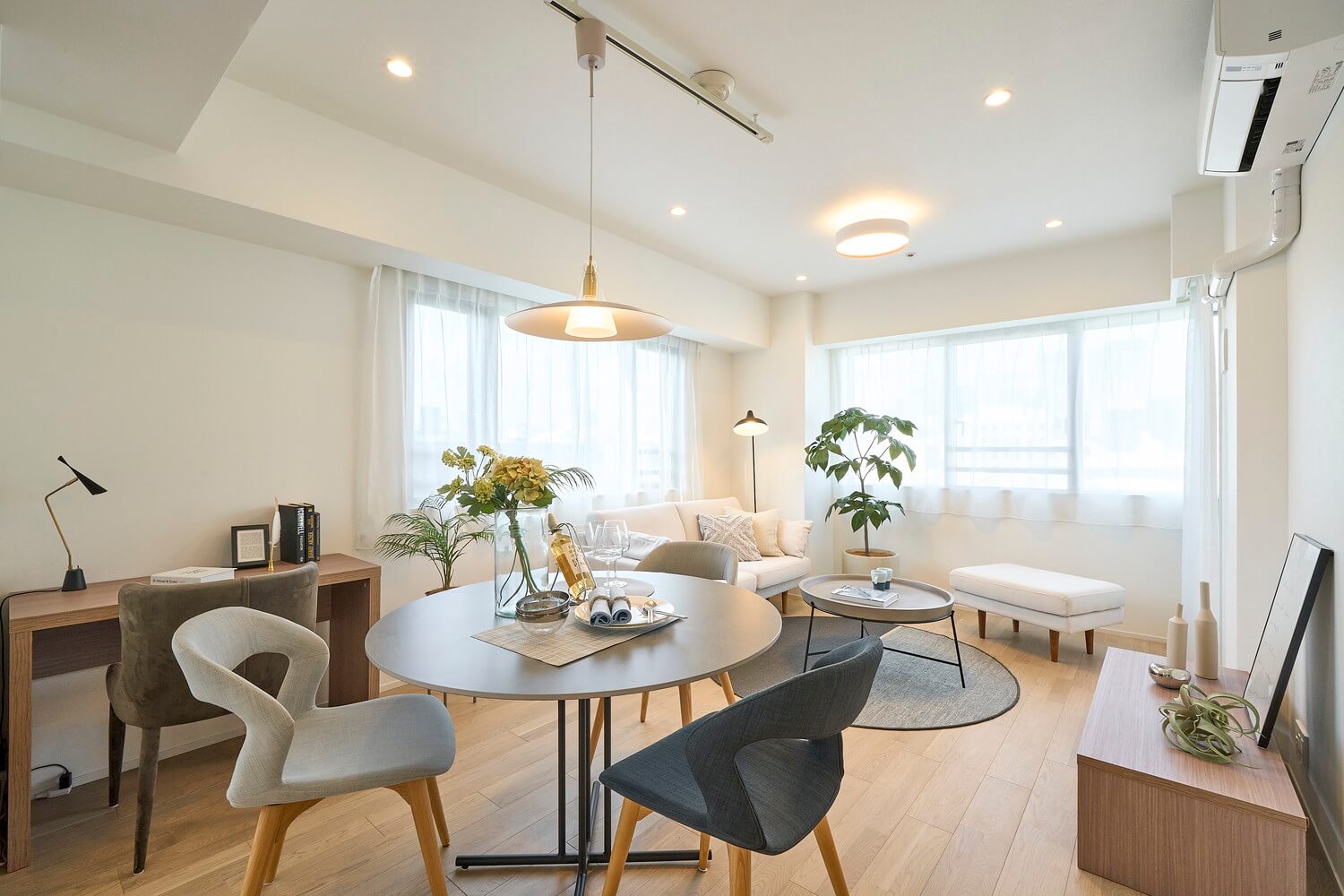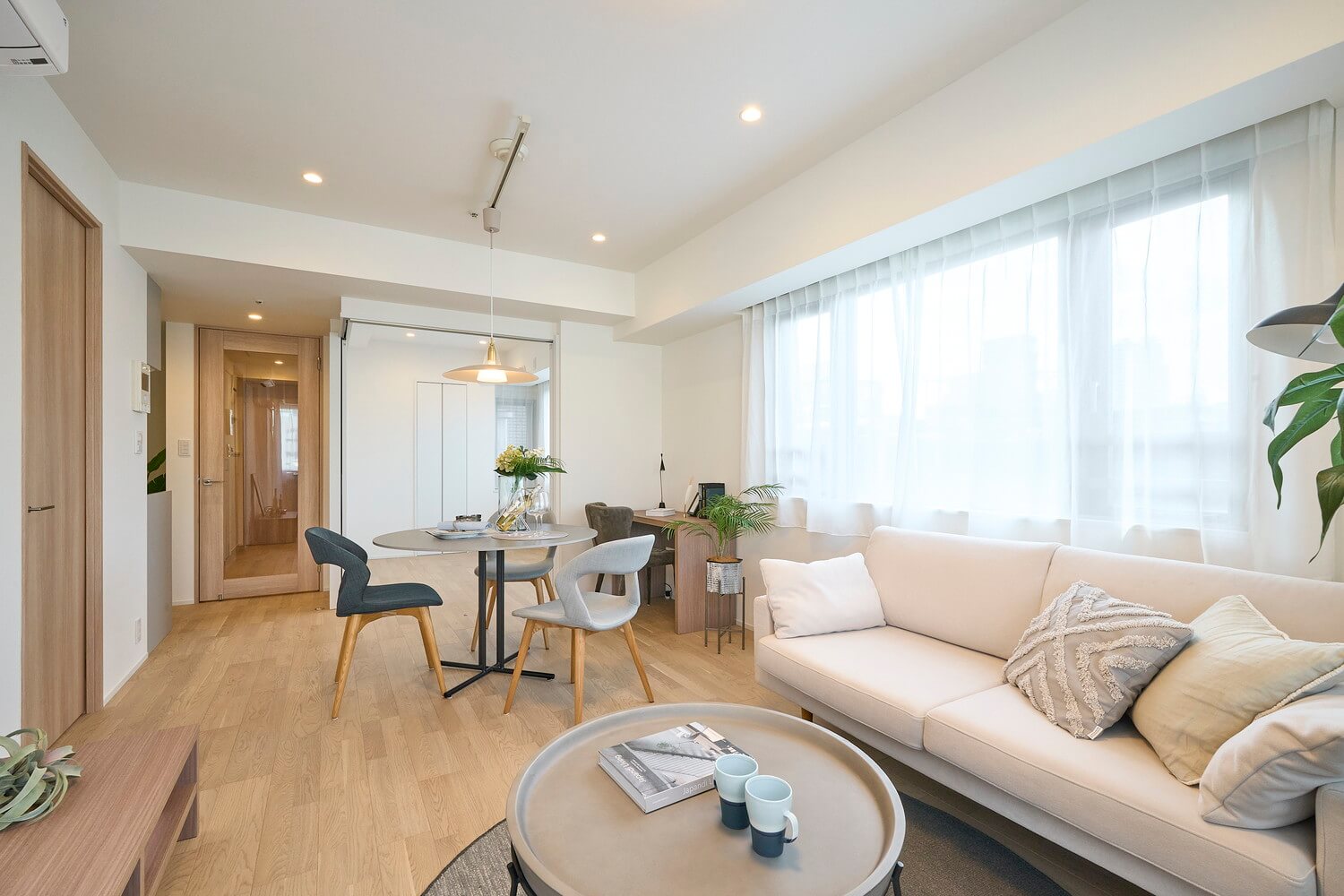 キッチンスペースを含め、約14.4帖のLDK。二面採光で自然な光を取り込みます。また、リビングダイニングとキッチンが空間分けされていて、生活感を感じさせないすっきりとした印象も感じられます。