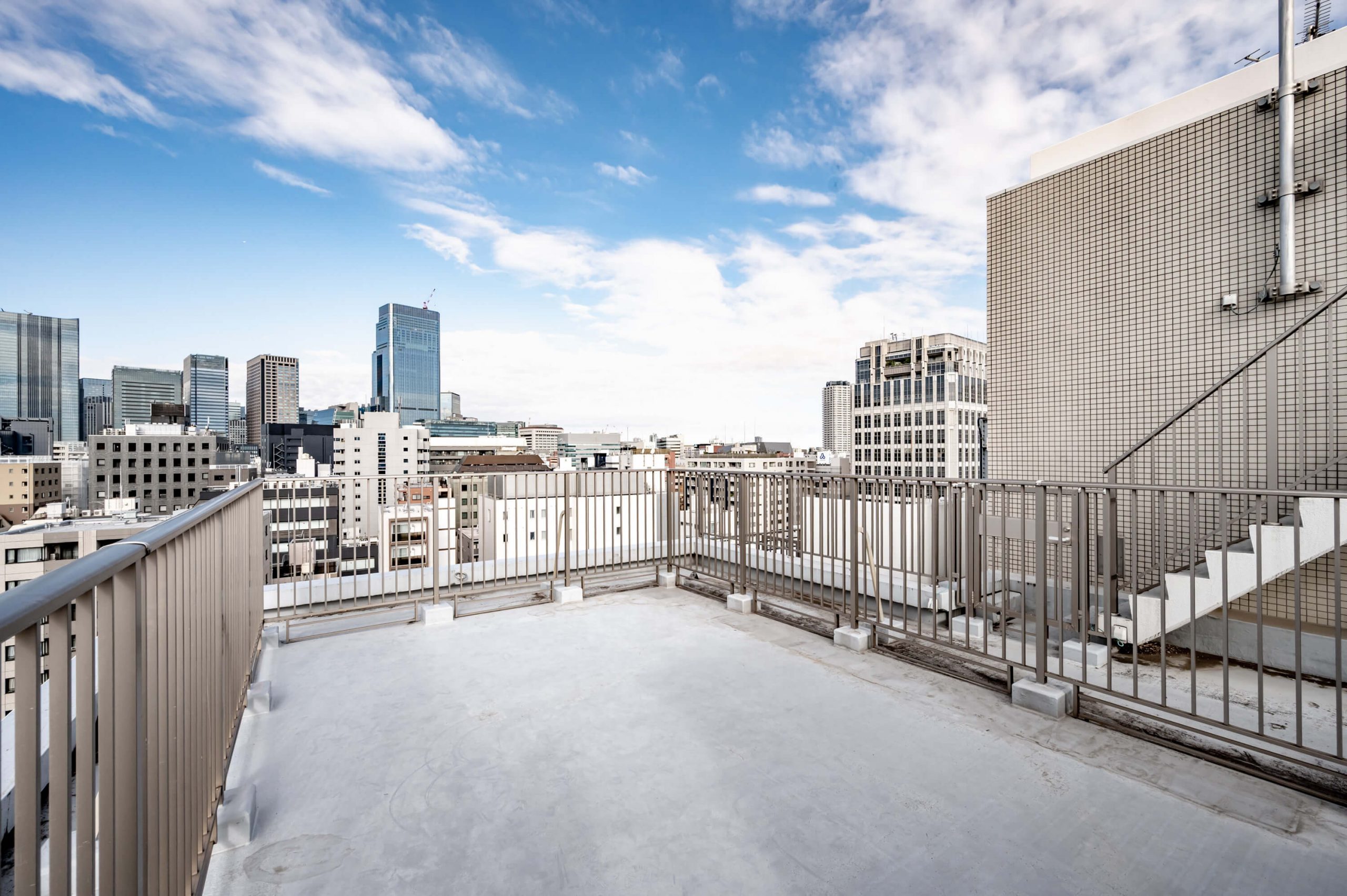 約37㎡のゆとりある広さのルーフガーデン。ウッドフロアを敷き、観葉植物やテーブルセットを並べて第二のリビングのようにも使えそうですね。最上階につき眺望も良好。マンションの目の前にある越前堀児童公園を見下ろせます。また、洋室1にもバルコニーが付いています。