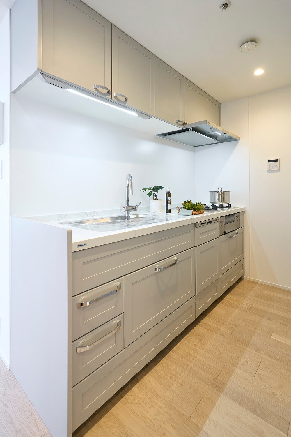 リビングと空間分けされたキッチンスペース。キッチンまわりの生活感をさりげなく目隠しできます。料理が捗る3口ガスコンロ、家事の時短に心強い食洗機付き。カップボード付きで収納スペースもしっかりと確保されています。