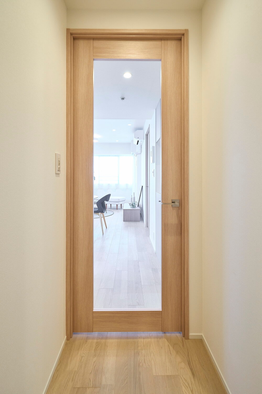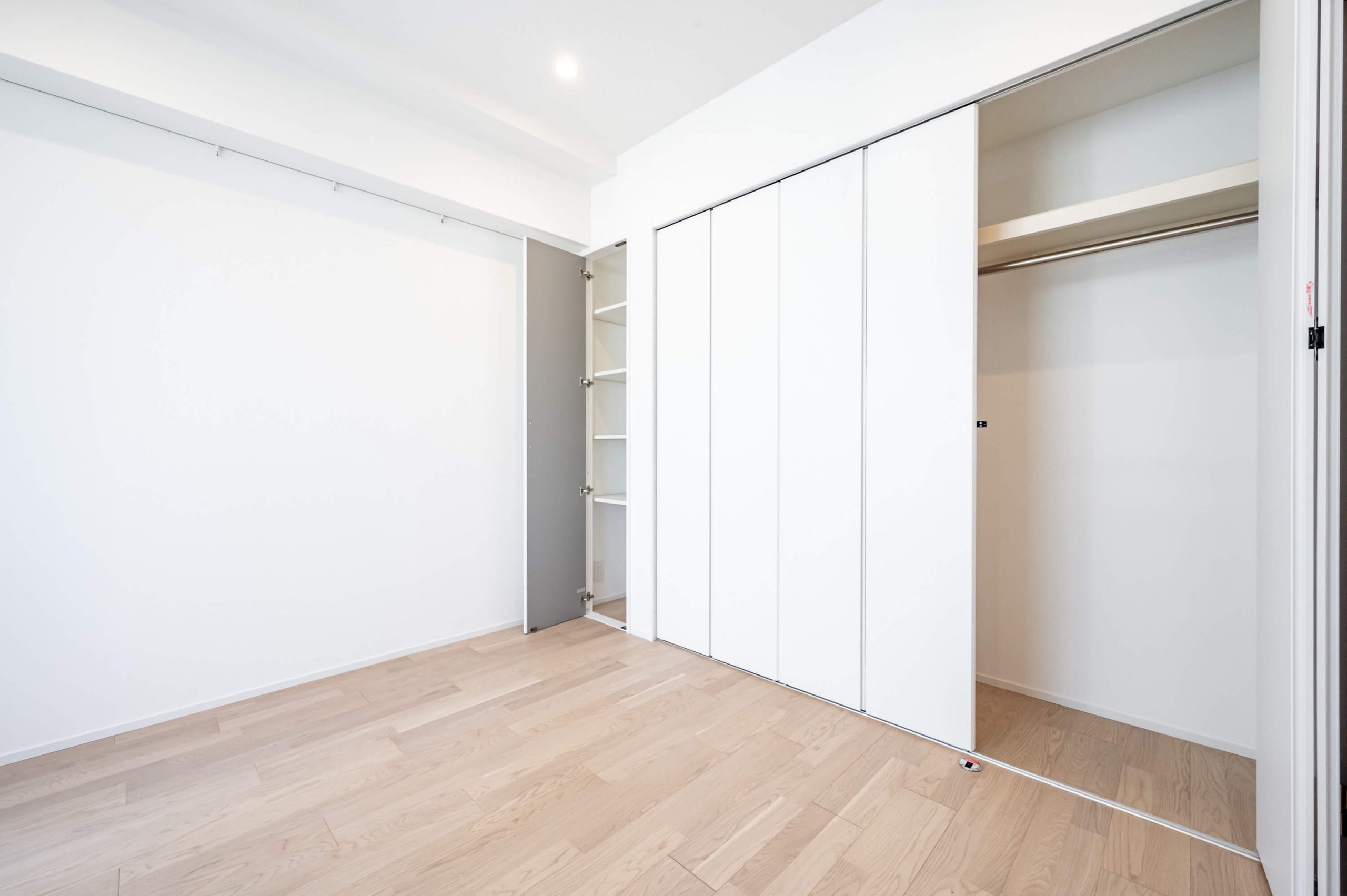 リビングと隣接した約4.8帖の洋室。扉の開口部が広く取られており、開放的に過ごせます。床にドアレールがないので見た目もすっきりとした印象です。クローゼットも付いています。