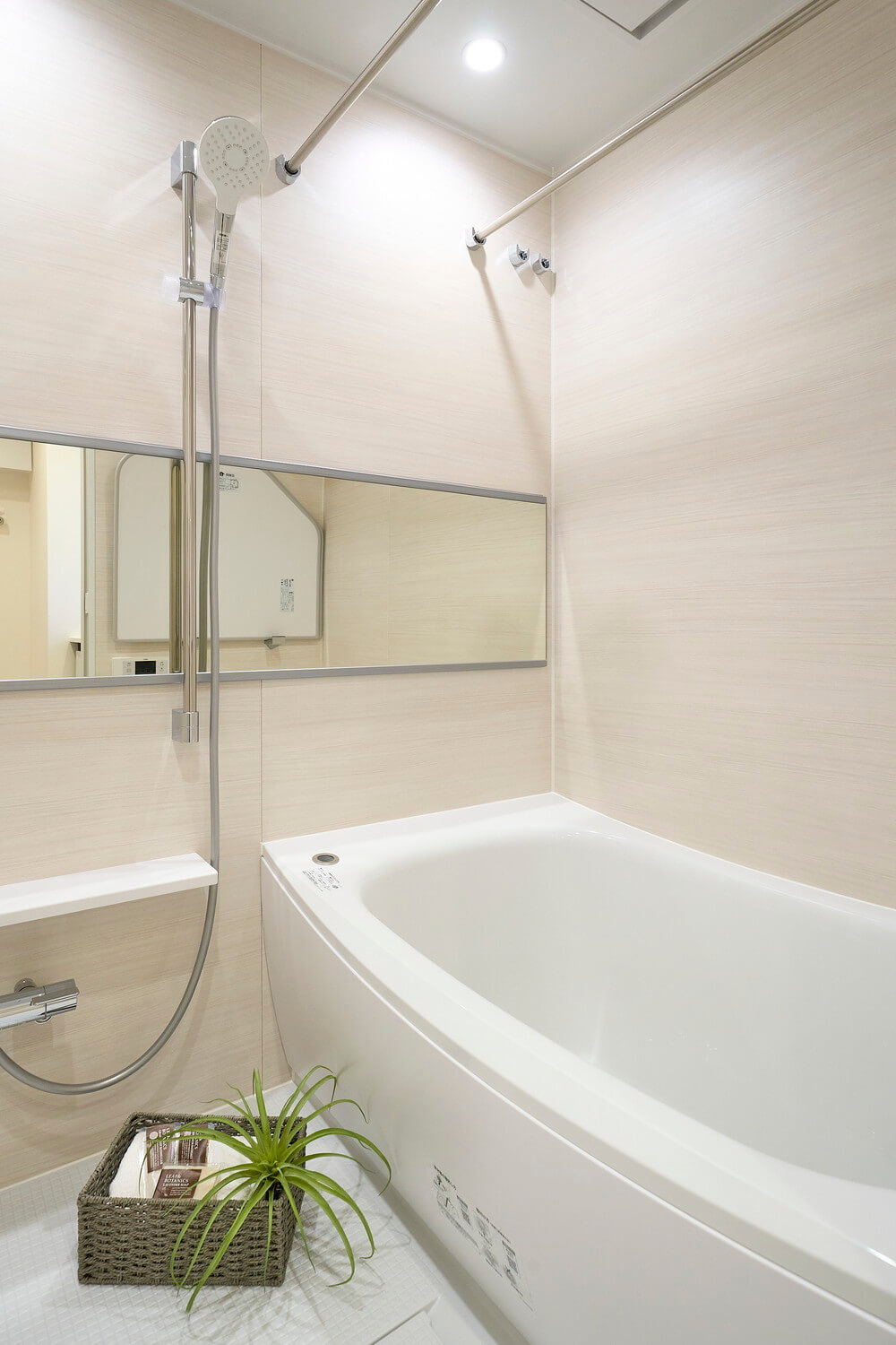 あたたかみのある雰囲気のTOTO製バスルーム。追い炊き機能の他、浴室換気乾燥とランドリーパイプ2本付きで雨の日や冬場の洗濯にも困りません。