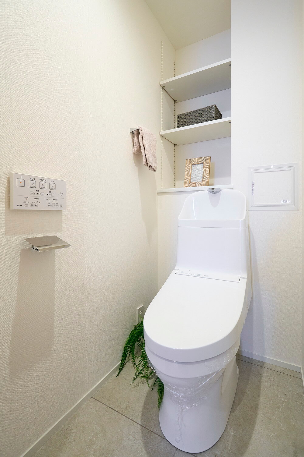 廊下に面したレストルーム。手洗いタンク付きのトイレです。収納棚、ウォシュレットも備わっています。
