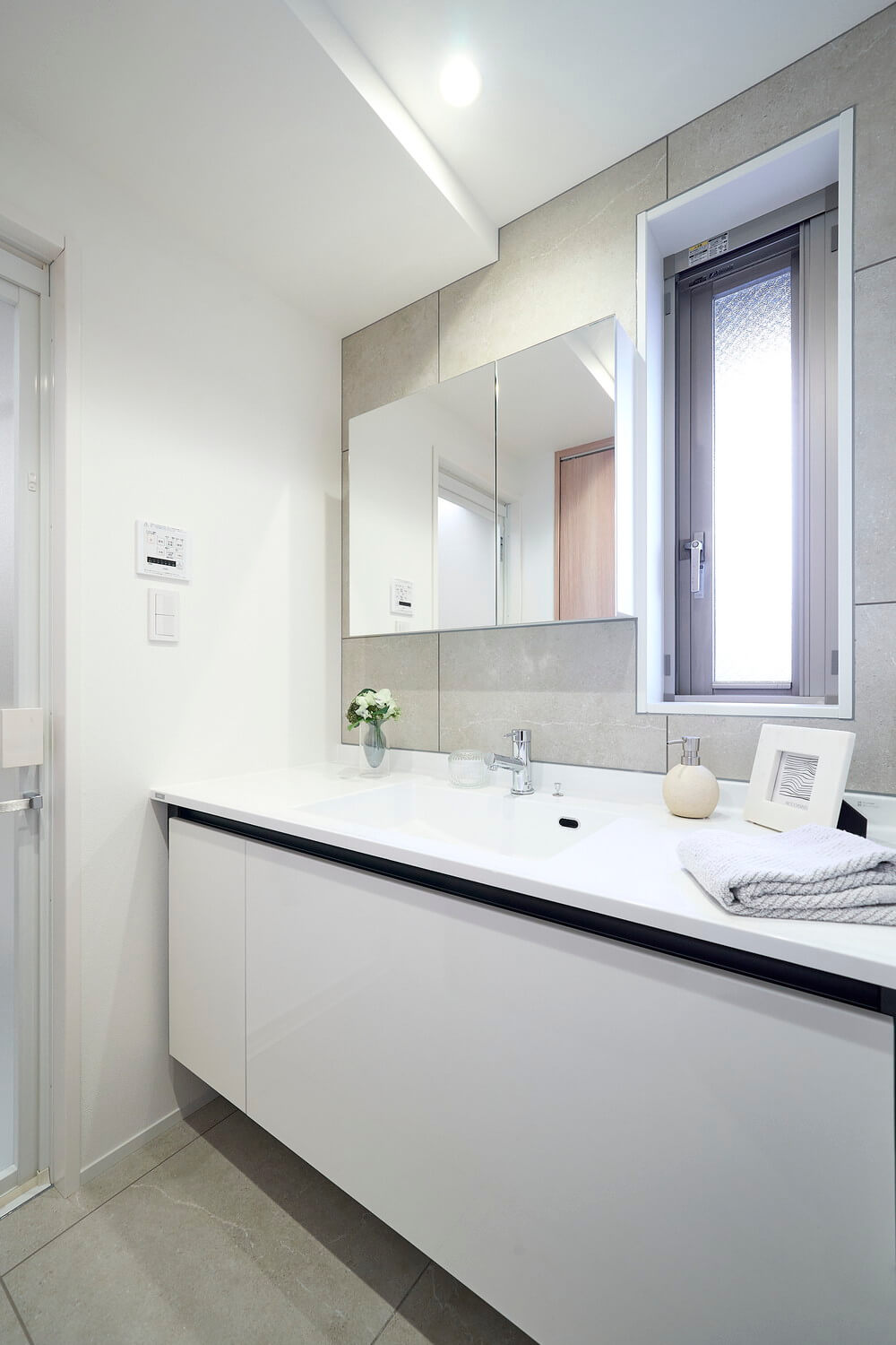 洗面化粧台は洗面まわりの小物がすっきり整頓できるミラーボックスや、モノの出し入れがしやすい引き出し式のキャビネット付きで使い勝手の良さもポイント。自然な光が入る小窓付きです。