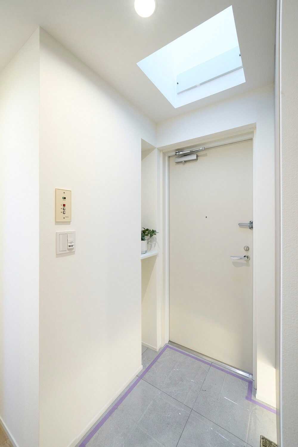 吹き抜け窓があり、やさしい光が入る玄関ホール。シューズボックスとカウンターが付いています。カウンターには季節の花やアートを飾って空間に彩りをプラスできます。リビングドアはガラス扉で開放的です。
