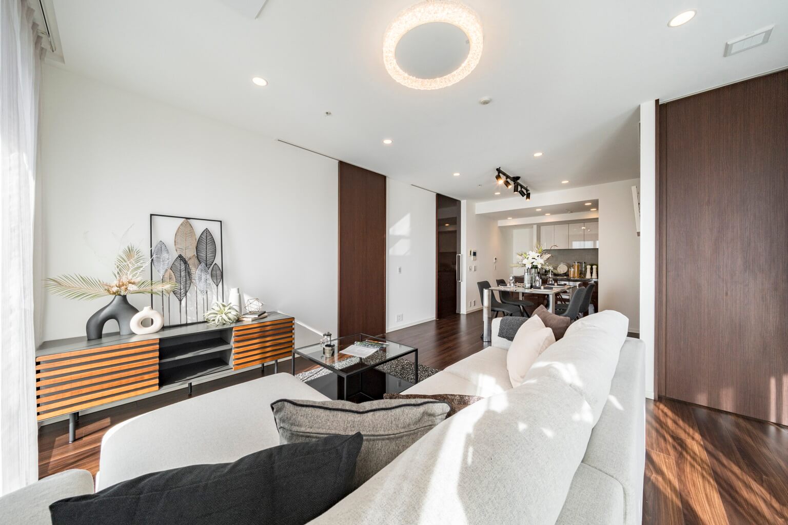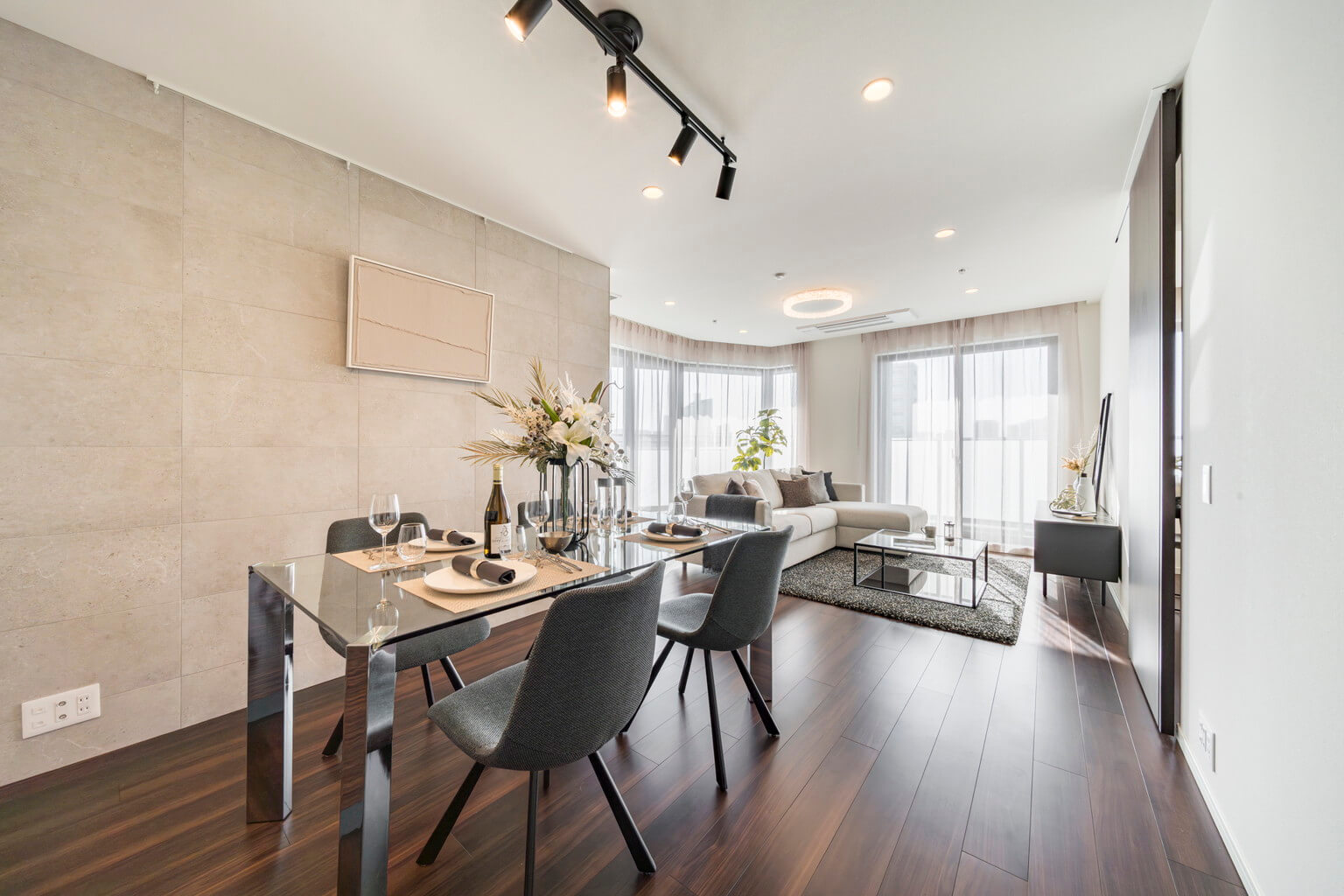 キッチンスペースを含め、約19.8帖のLDK。家族でゆったり過ごせる広さです。南東向きの二面採光で陽当り良好。開放感も感じられます。壁の一面がストーン調のアクセントウォールになっており、スタイリッシュな雰囲気も◎。ピクチャーレールが設置されていて、キズをつけずにアートや写真が飾れます。