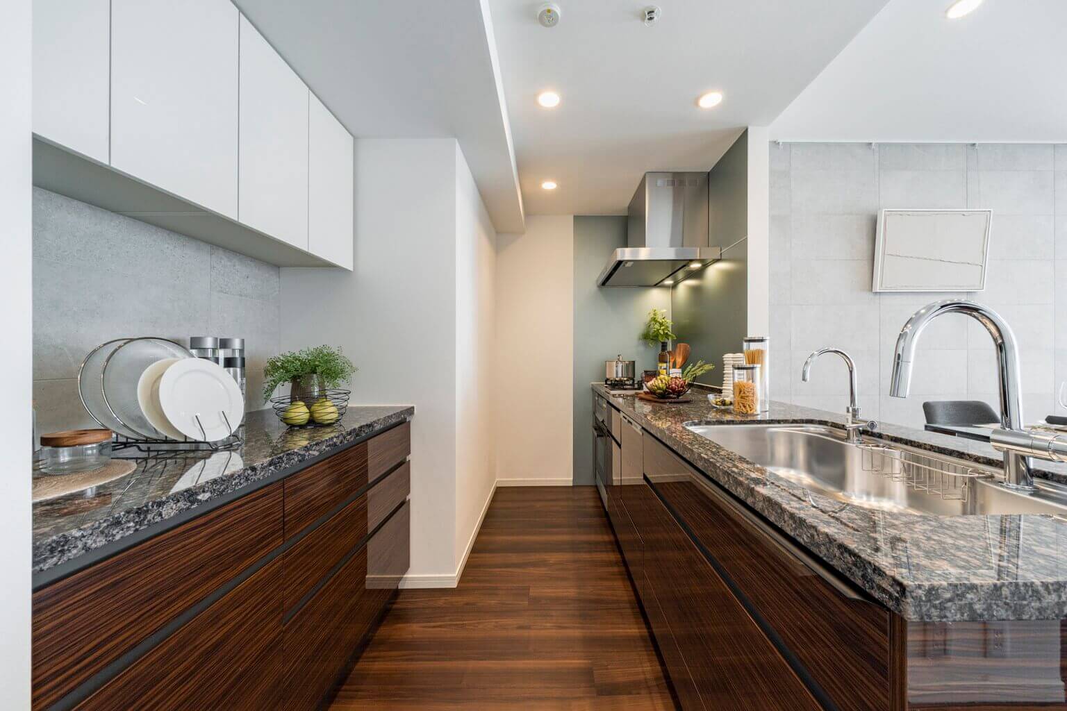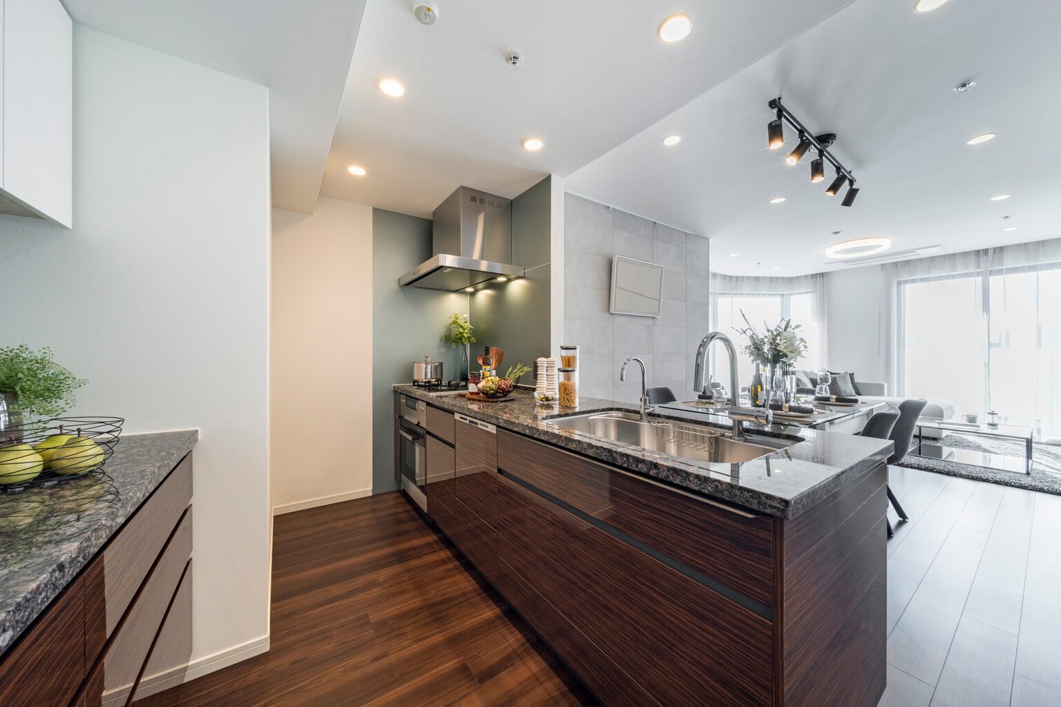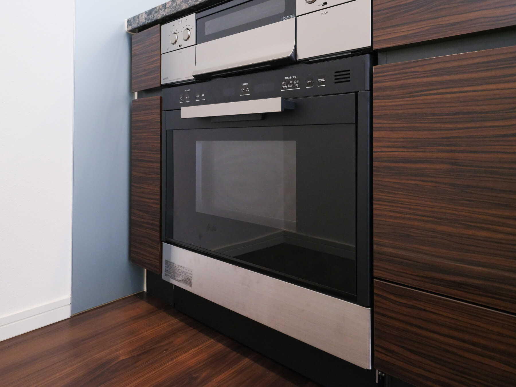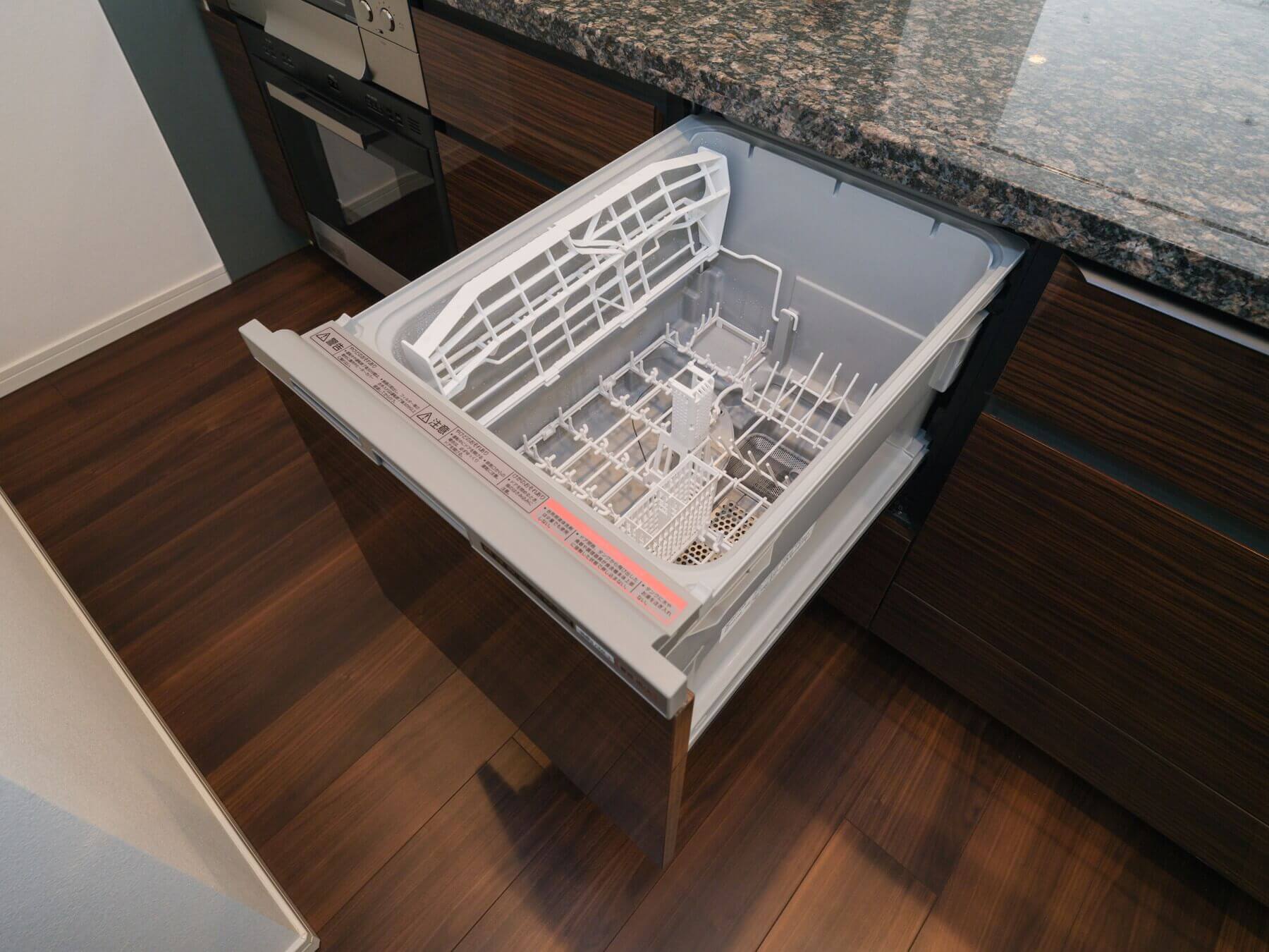 家族やゲストと会話が弾む対面型のシステムキッチン。小さなお子さんがいるご家庭では子どもの姿も見守れます。ダークトーンの高級感漂う雰囲気。料理が捗る3口ガスコンロ、家事の時短に心強い食洗機、料理の幅が広がるビルトインオーブン付きで設備も充実しています。カップボードも設置されていて、収納スペースもしっかりと確保されています。