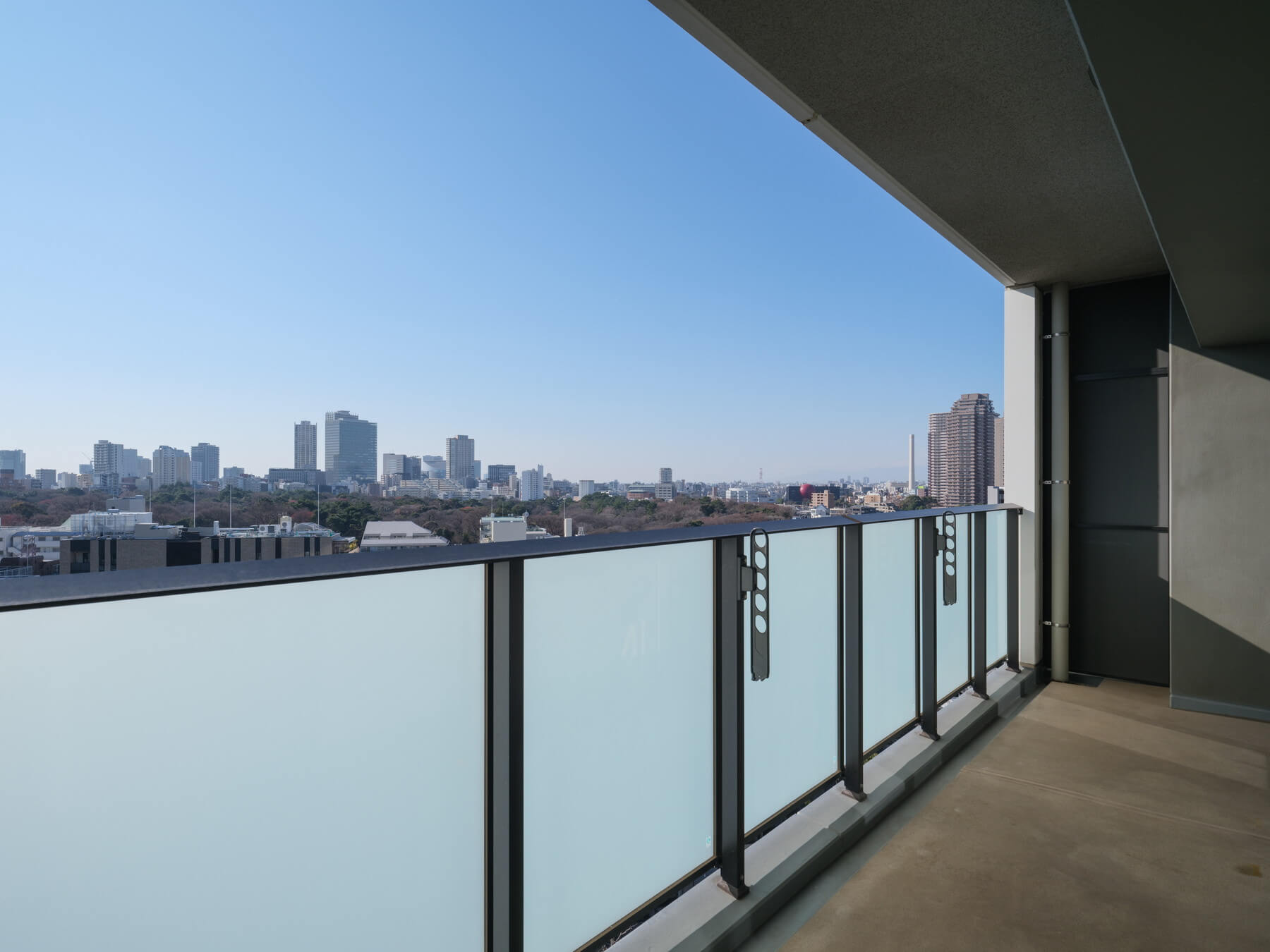 東と南の2面にバルコニーが付いています。写真はリビングと2つの洋室に面した南向きのバルコニー。ゆとりある広さで陽当りも良好です。また、13階部につきバルコニーからの見晴らしも良く、自然教育園の緑も望めます。