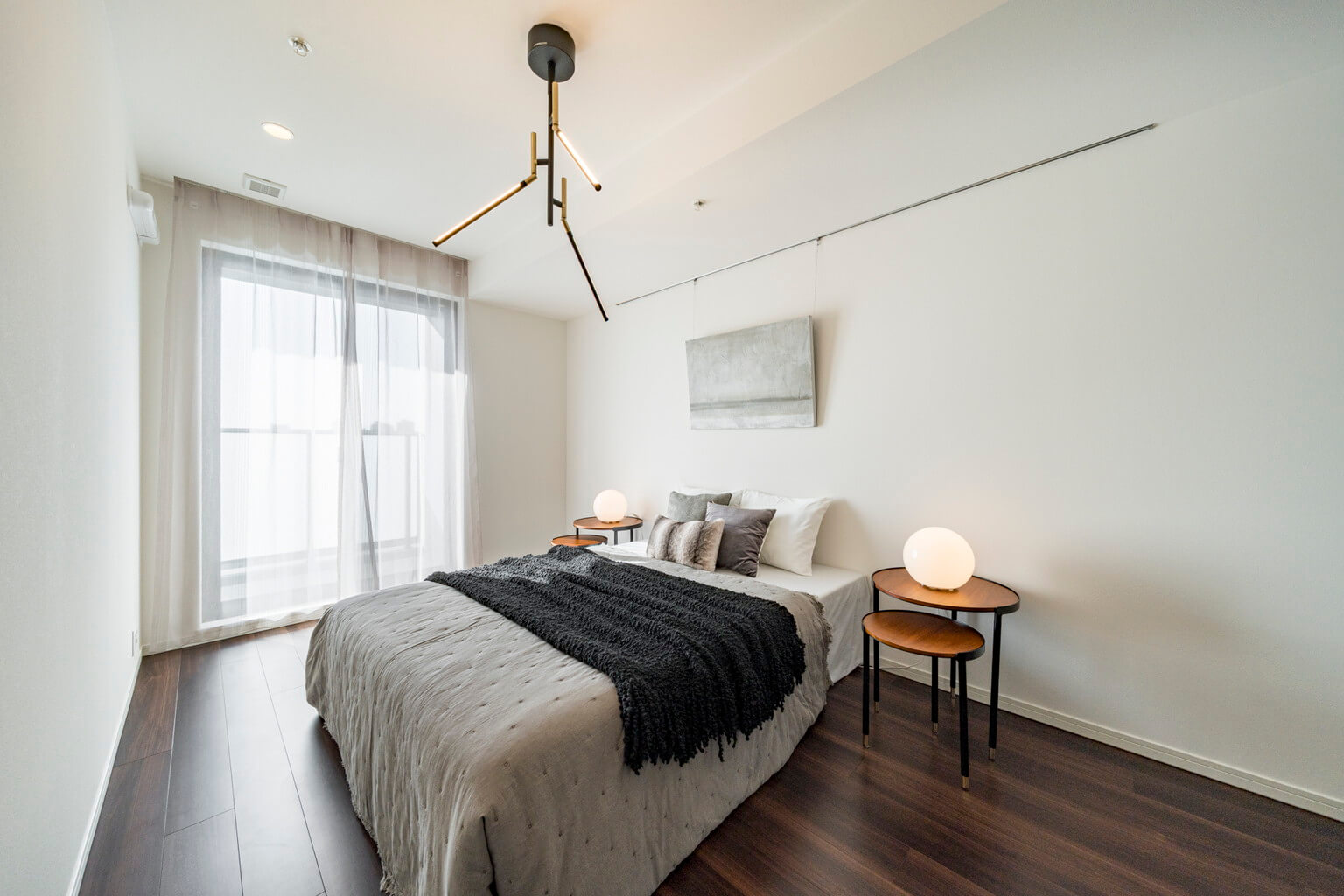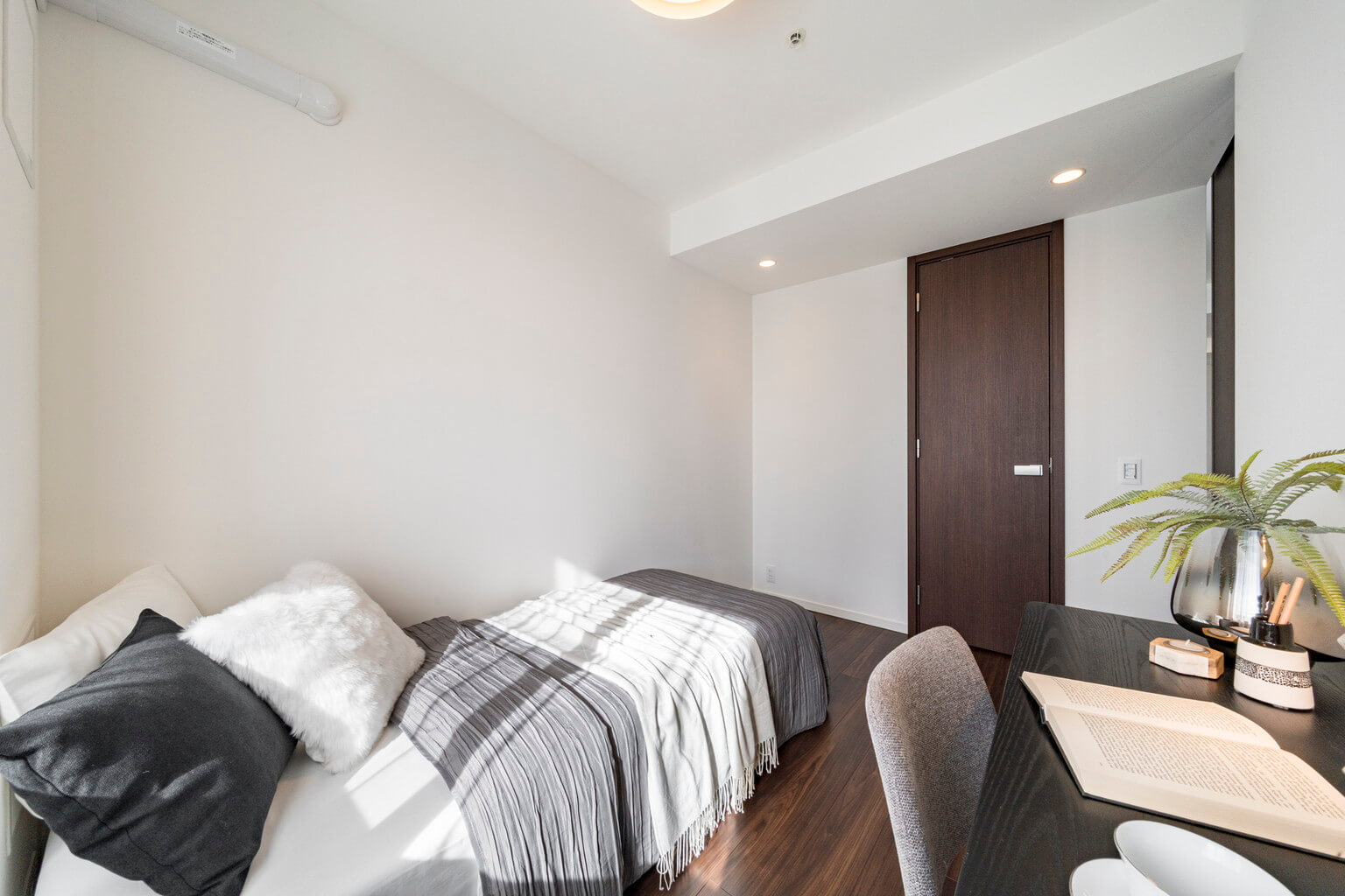 約8.0帖の洋室1。3つの洋室で一番広いお部屋です。自然な光が入る南向き、バルコニーへの出入りも可能です。壁にはピクチャーレールが設置されており、キズをつけずにアートや写真が飾れます。WIC(ウォークインクローゼット)付きで洋服がたっぷり収納できます。