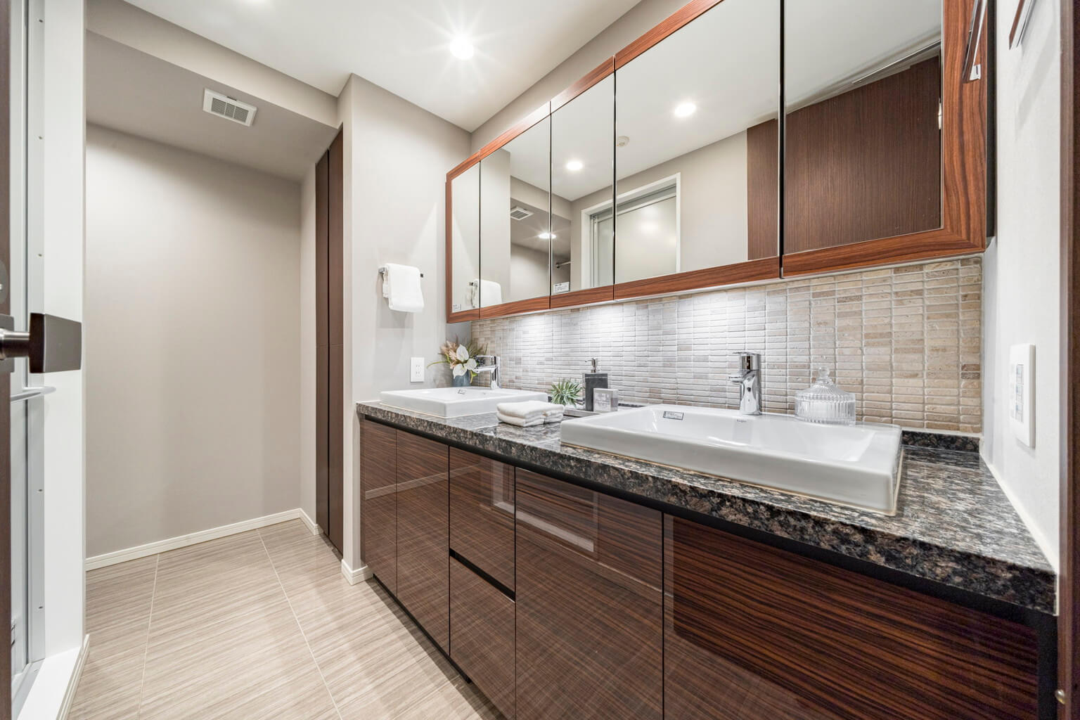 ホテルライクな2ボウルの洗面化粧台。家族で使用時間が重なっても、それぞれゆっくり使えます。高級感漂うデザインが印象的。洗面まわりの小物がすっきり整頓できるミラーボックスや、洗面下の収納スペース、リネン庫付きです。
