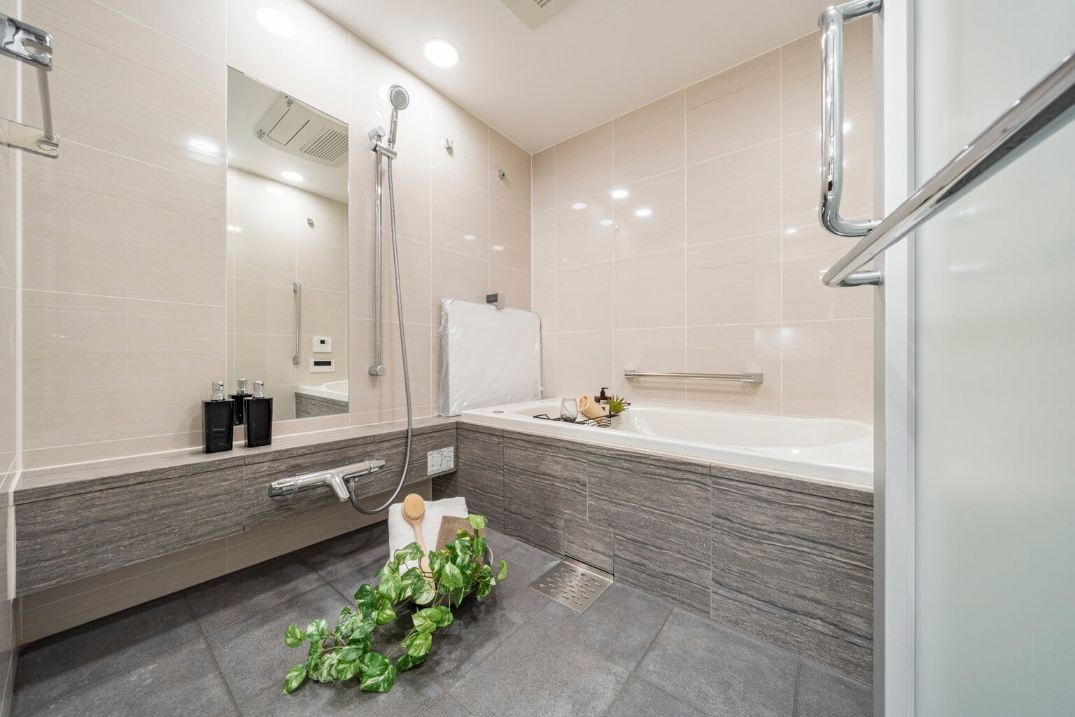ゆとりある広さのバスルーム。上品な雰囲気が感じられるタイル貼りです。追い炊き機能、浴室換気乾燥付きです。