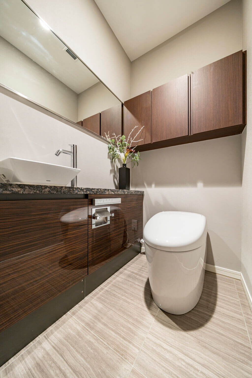 廊下に面したレストルーム。空間がすっきり見えるタンクレストイレです。手洗いカウンター、ウォシュレット、収納スペースも備わっています。