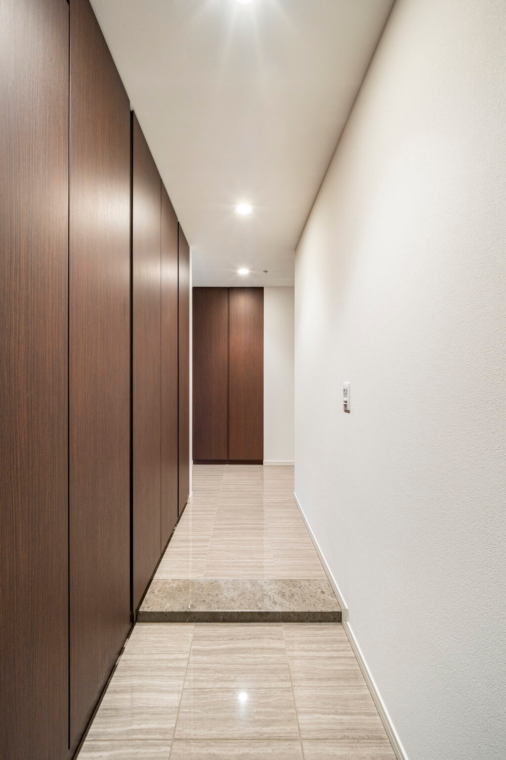 つやつやとした光沢感のあるタイル貼りで、ホテルライクな上品な雰囲気の玄関ホール。大容量のクローゼット付きで靴がたっぷりと収納できます。また、廊下にも物入が備わっていて、収納スペースが充実しています。
