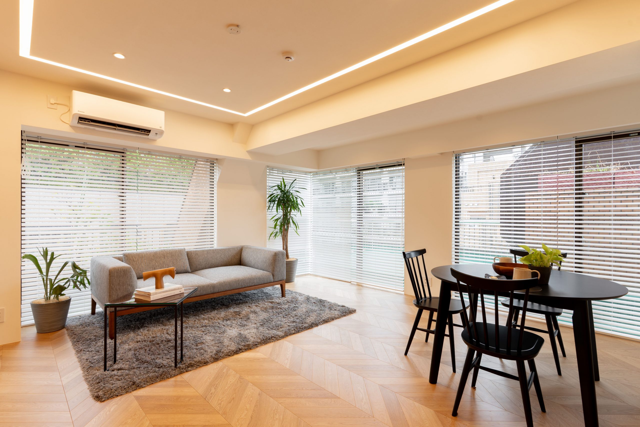 東京メトロ銀座線・半蔵門線・都営大江戸線「青山一丁目」駅より徒歩5分、港区赤坂8丁目の閑静な住宅街に佇むヴィンテージマンションです。お部屋は最上階角部屋の2LDK。約12mのワイドスパン設計で、約36.60㎡の広々としたバルコニーが付いています。ユナイテッドアローズ社監修のリノベーションで、LDKの床にはヘリンボーン柄を採用し、こだわりの空間を演出しています。また、ペットとも一緒に暮らすことができますよ。