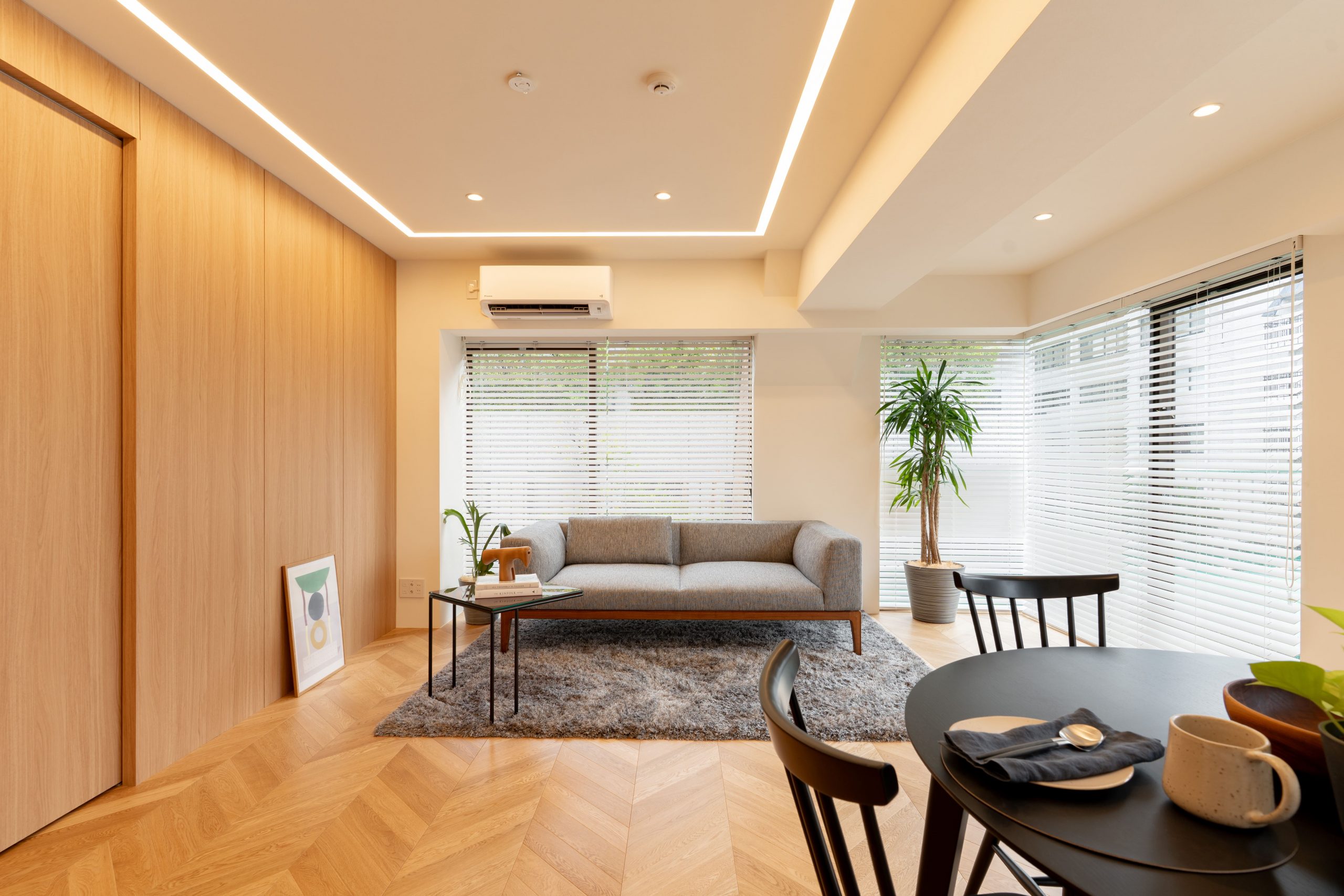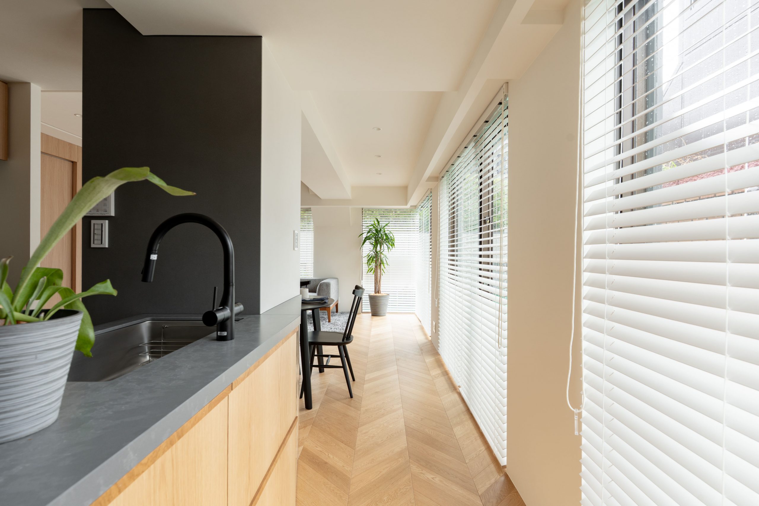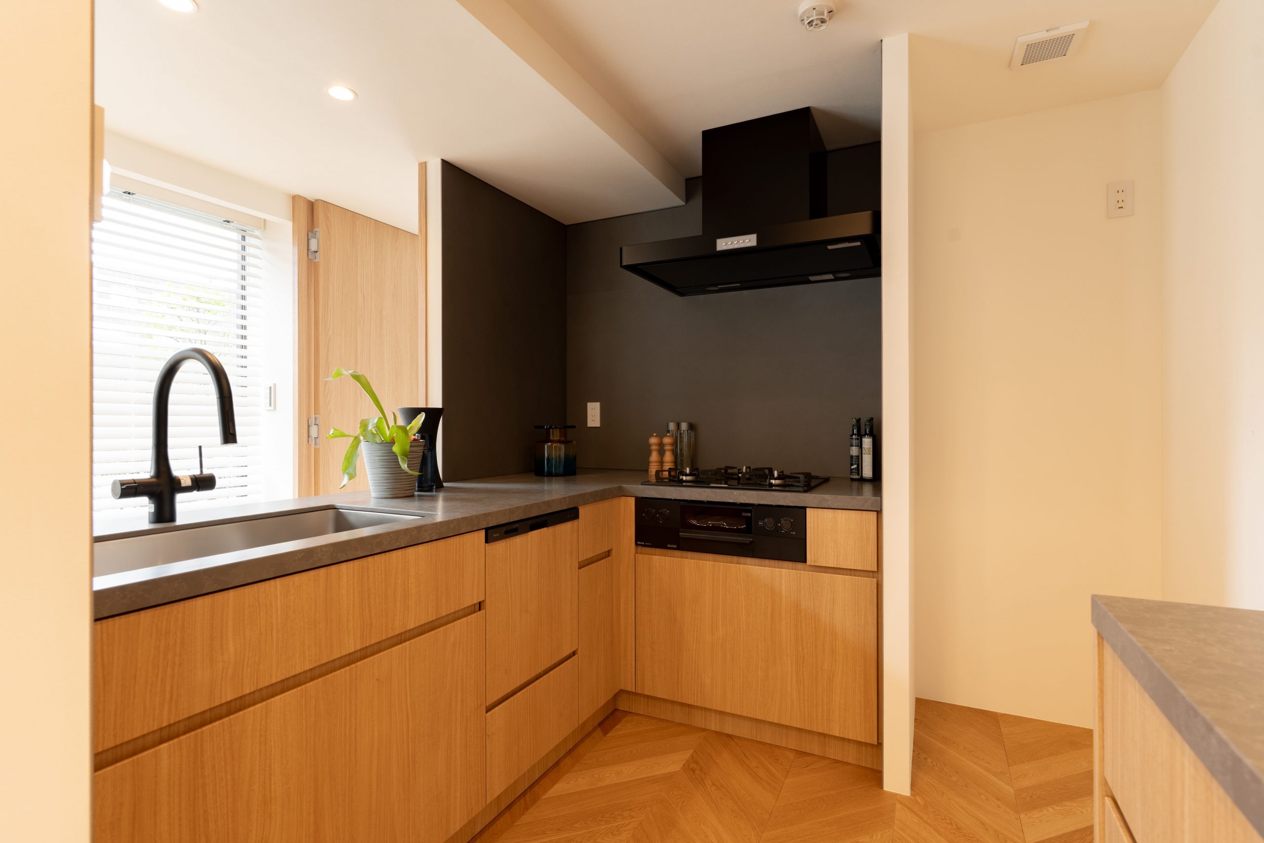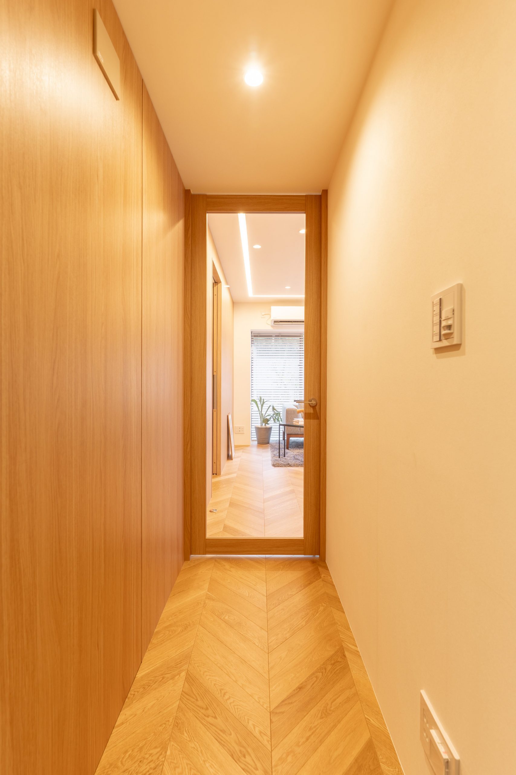 フローリングはヘリンボーン柄を採用。モダン・ヴィンテージ・ラグジュアリー、どのテイストとも好相性なので、インテリアに幅が出ます。また、自然光や間接照明を受けて、