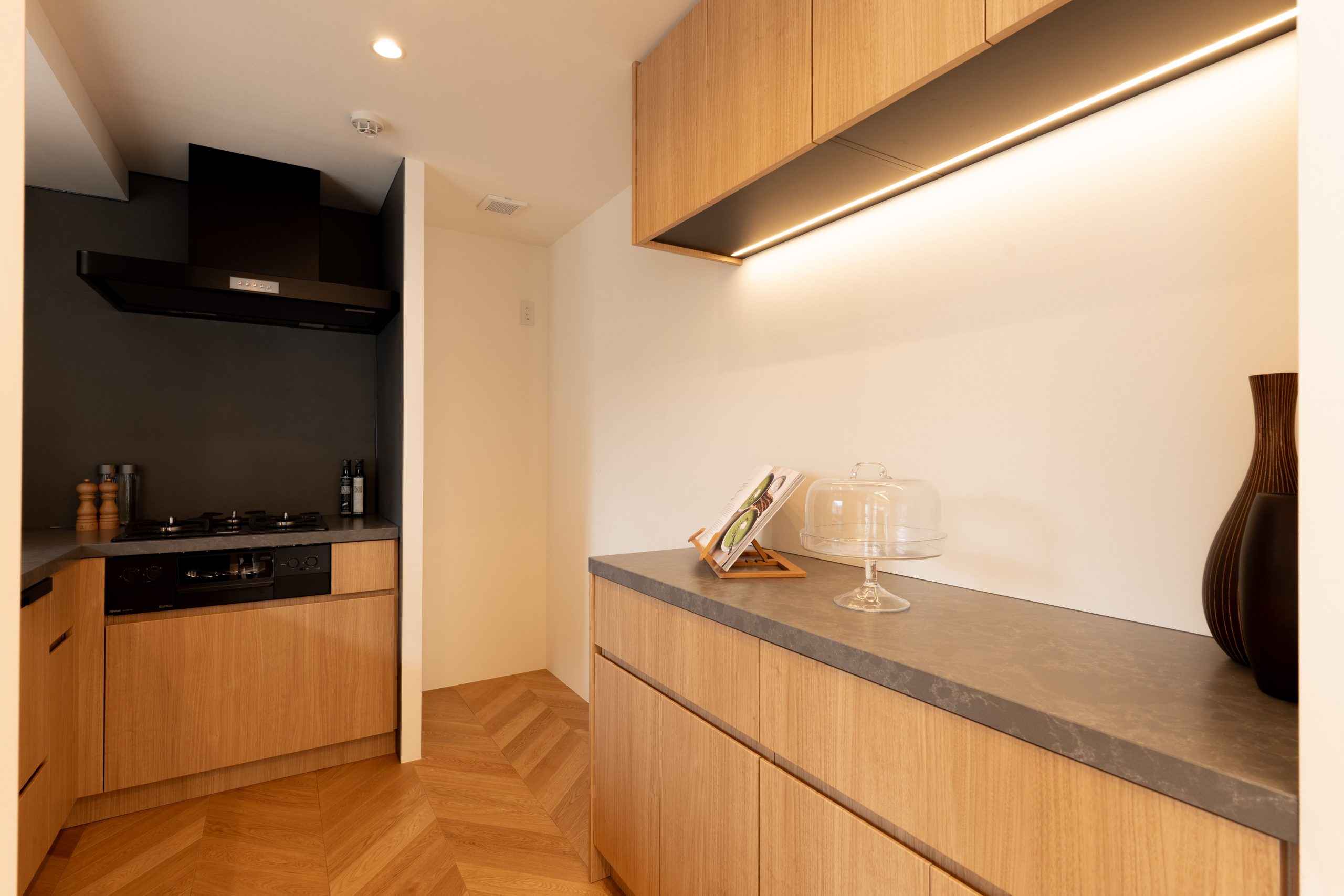 キッチンの背面側にはカップボードが備え付けられています。調味料や食器などを収納できるだけでなく、電子レンジなどを置くこともできるので便利です。