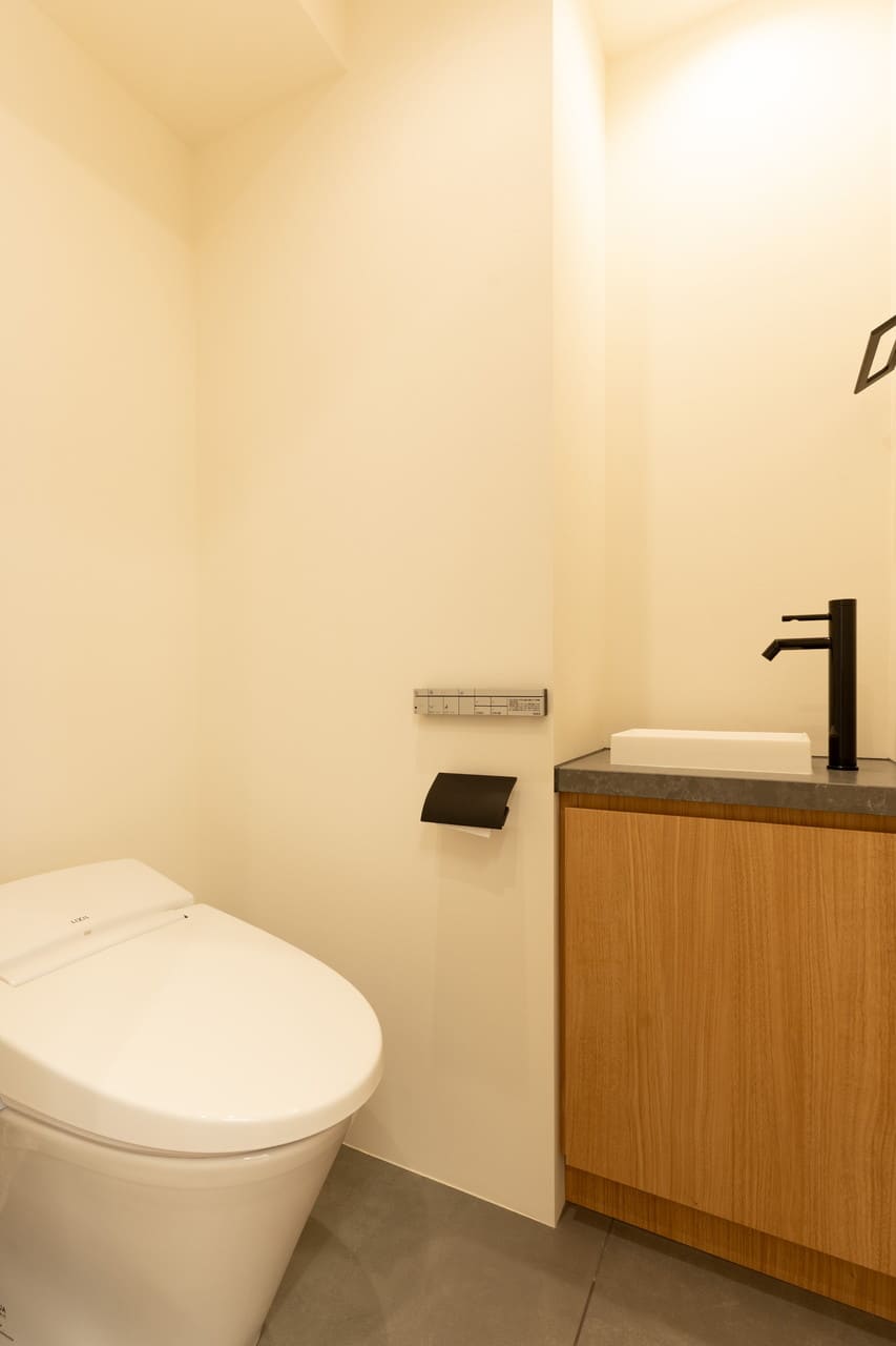 LIXIL製のウォシュレット一体型のトイレです。タンクレスタイプなのですっきりとした印象に。また、別途で手洗い器が造られているので、すぐに手を洗うことができて衛生的です。
