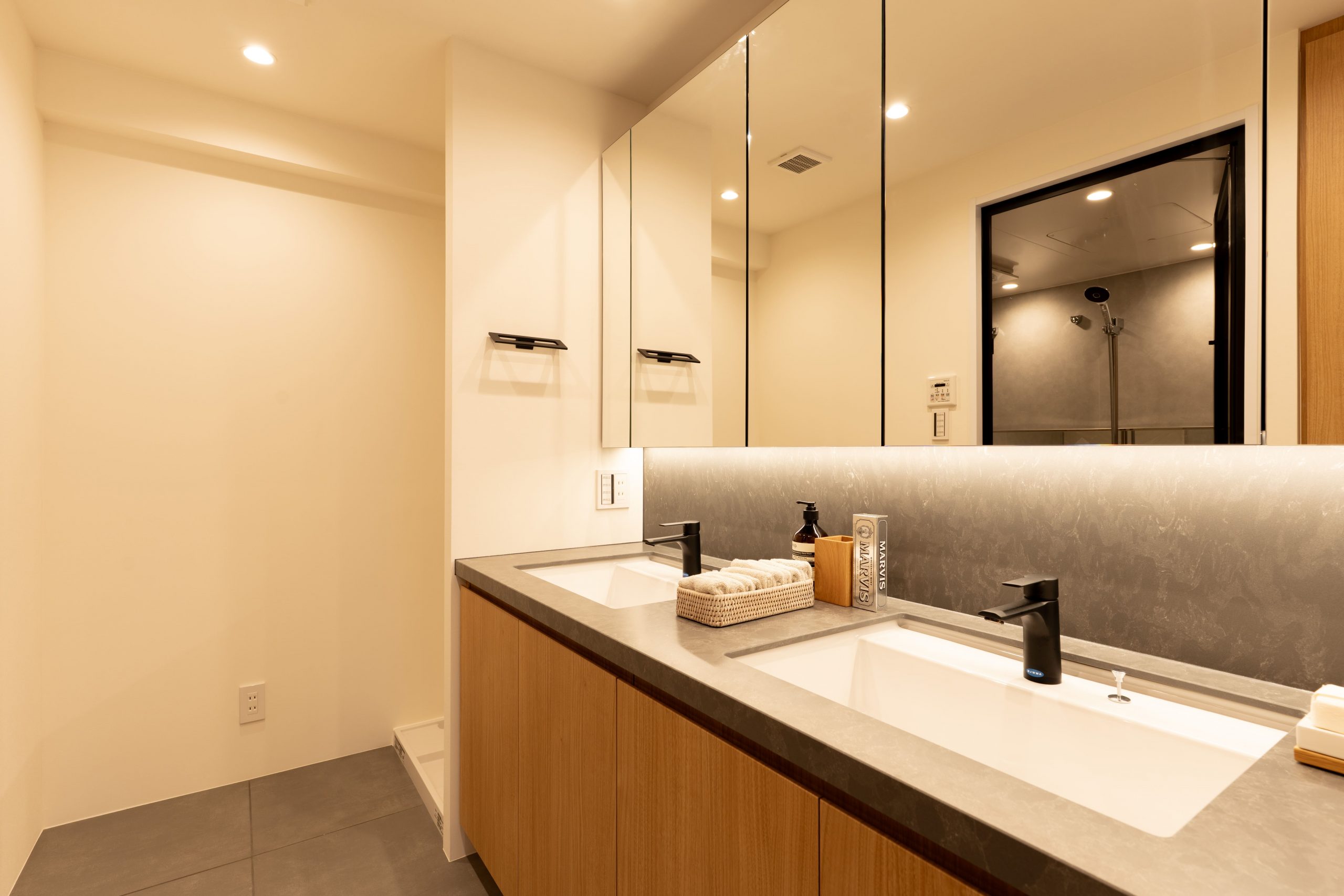 ホテルライクな2ボウル洗面の化粧台です。忙しい朝も並んで支度ができて◎。また、大きなミラーボックスの中には化粧品などが収納できて使い勝手も良好です。