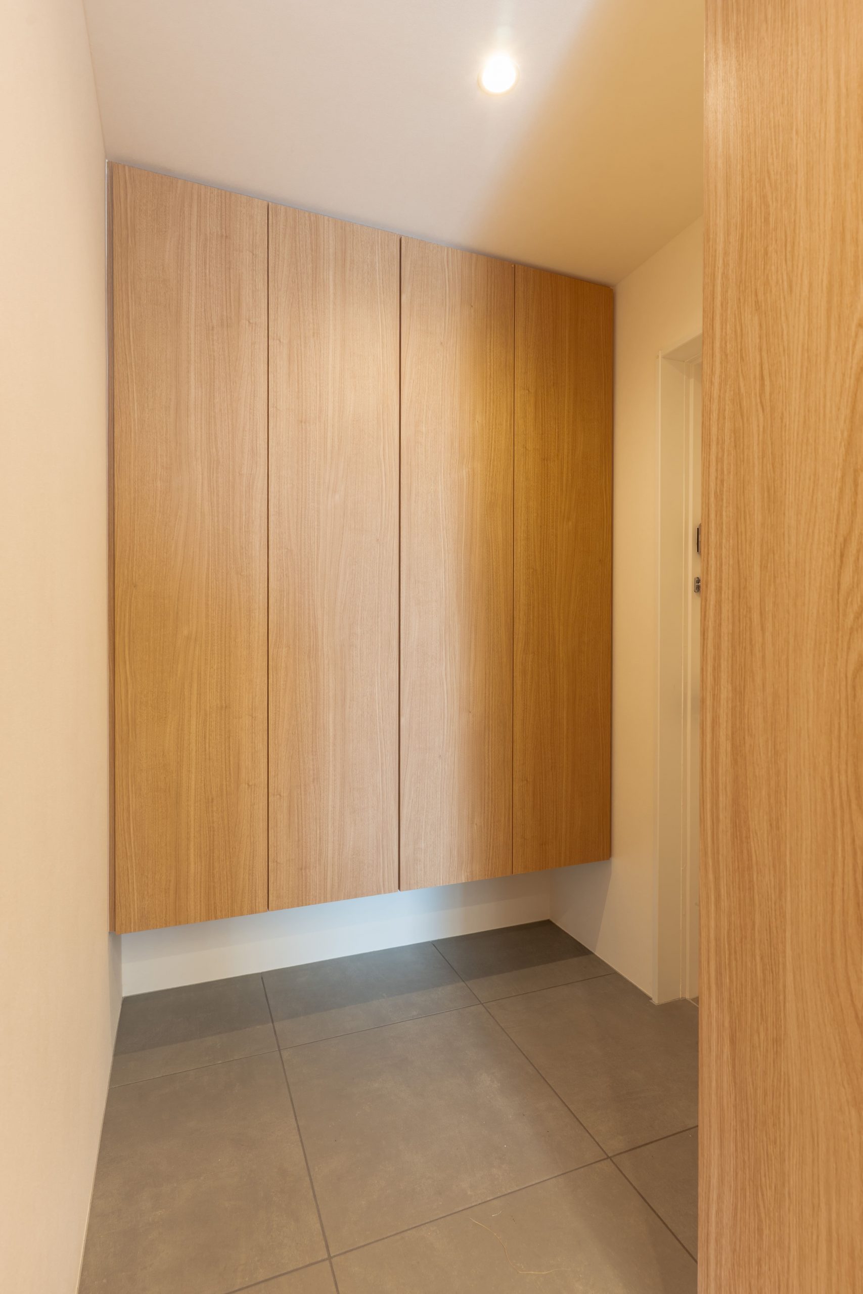 ナチュラルな雰囲気の玄関には背の高いシューズボックスが備え付けられていますが、フロートタイプのため空間に圧迫感を与えません。照明には人感センサーが付いており、帰宅時に両手が塞がっていても安心です。消し忘れも防止できて節電にもなります。