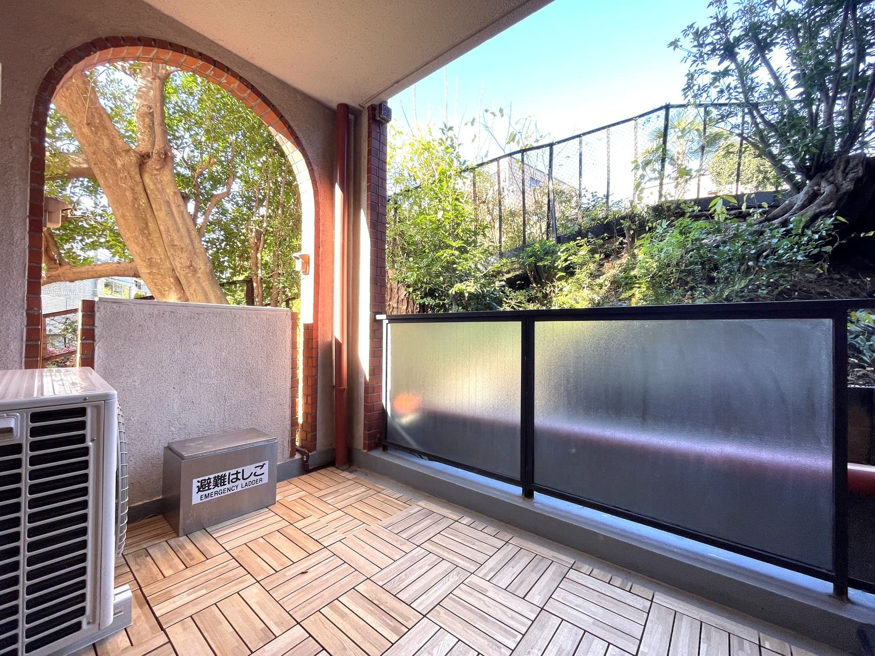 約6.74㎡のバルコニーは北西向きです。ウッドパネルが敷かれていたり、レンガ調×アーチ形のデザインが印象的で、一般的な直線的バルコニーとは一線を画すクラシカルで趣のある空間です。また、目の前に植栽や大きな樹木が広がり、外部からの視線が自然にカットされているのも◎。