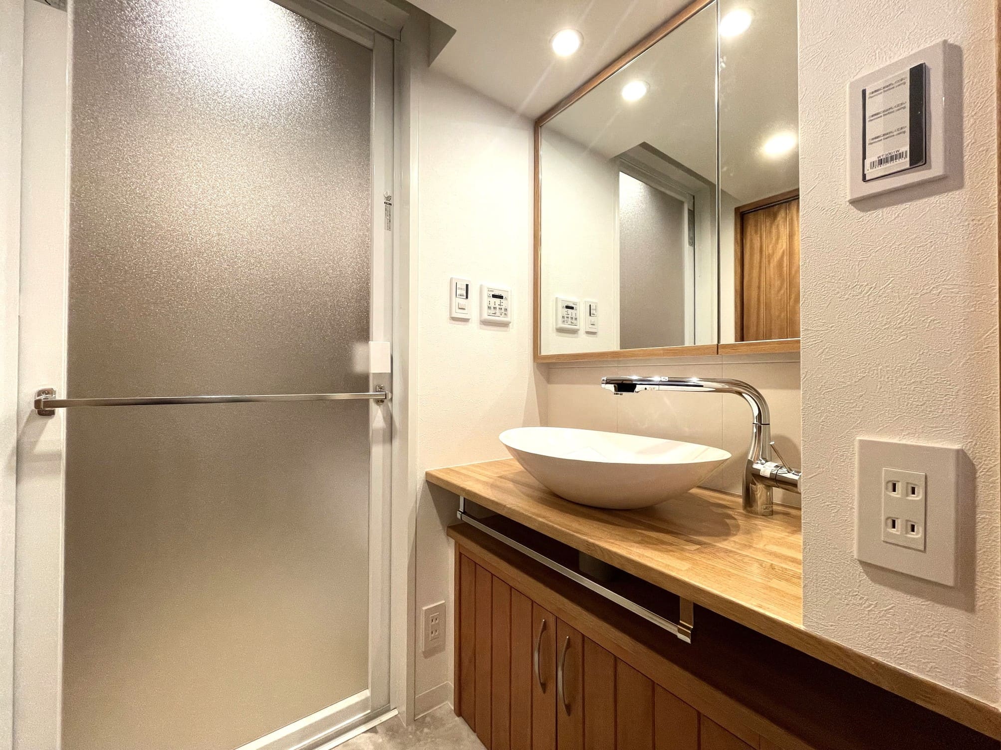 丸みを帯びたおしゃれな置き型式の洗面ボウルが特徴的な化粧台です。下部にはタオルハンガーや収納スペースが造られています。