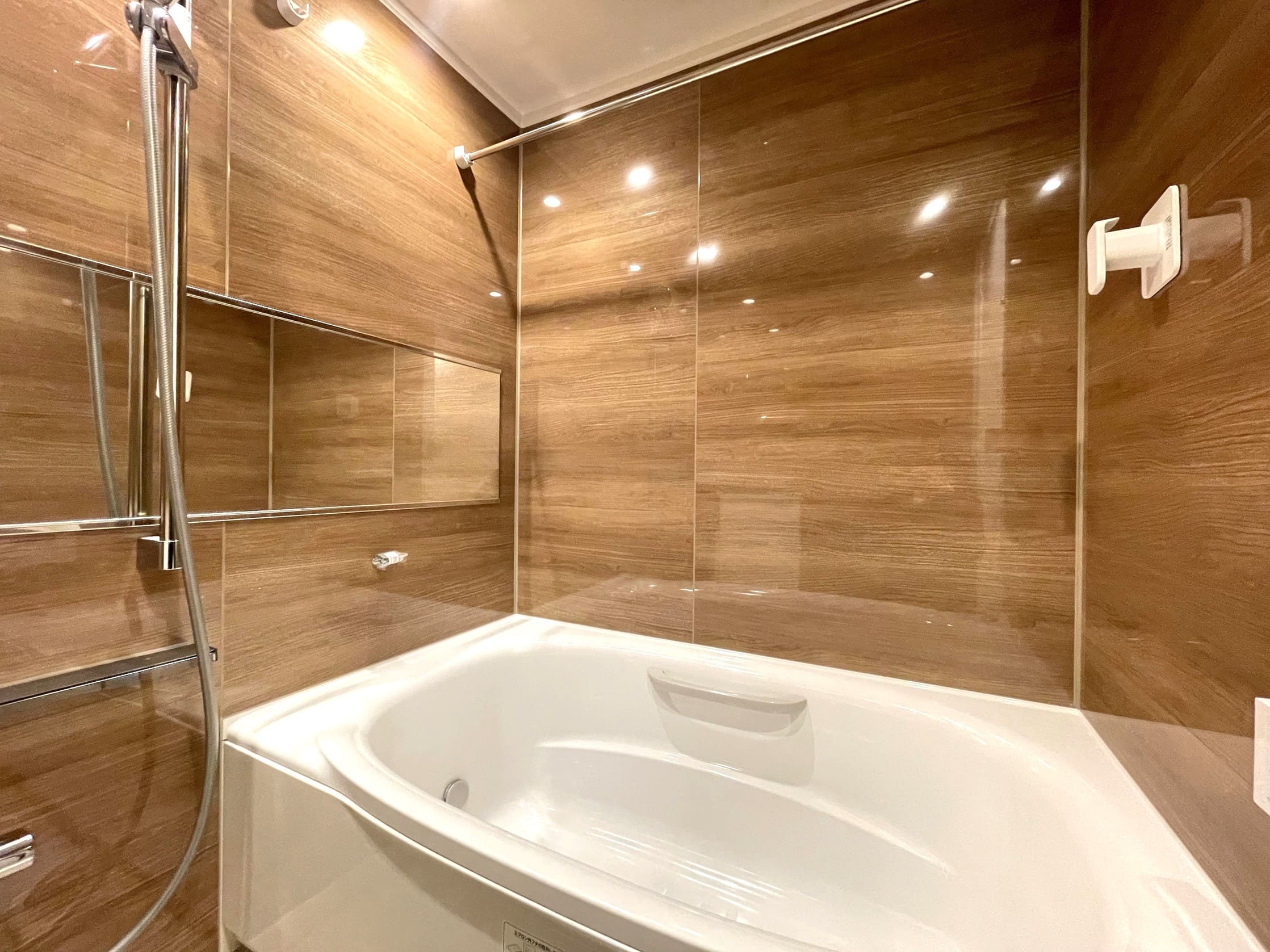 ブラウンの壁パネルが落ち着いた雰囲気を演出してくれている浴室です。浴室乾燥機付きのため雨の日の洗濯物にも困りません。