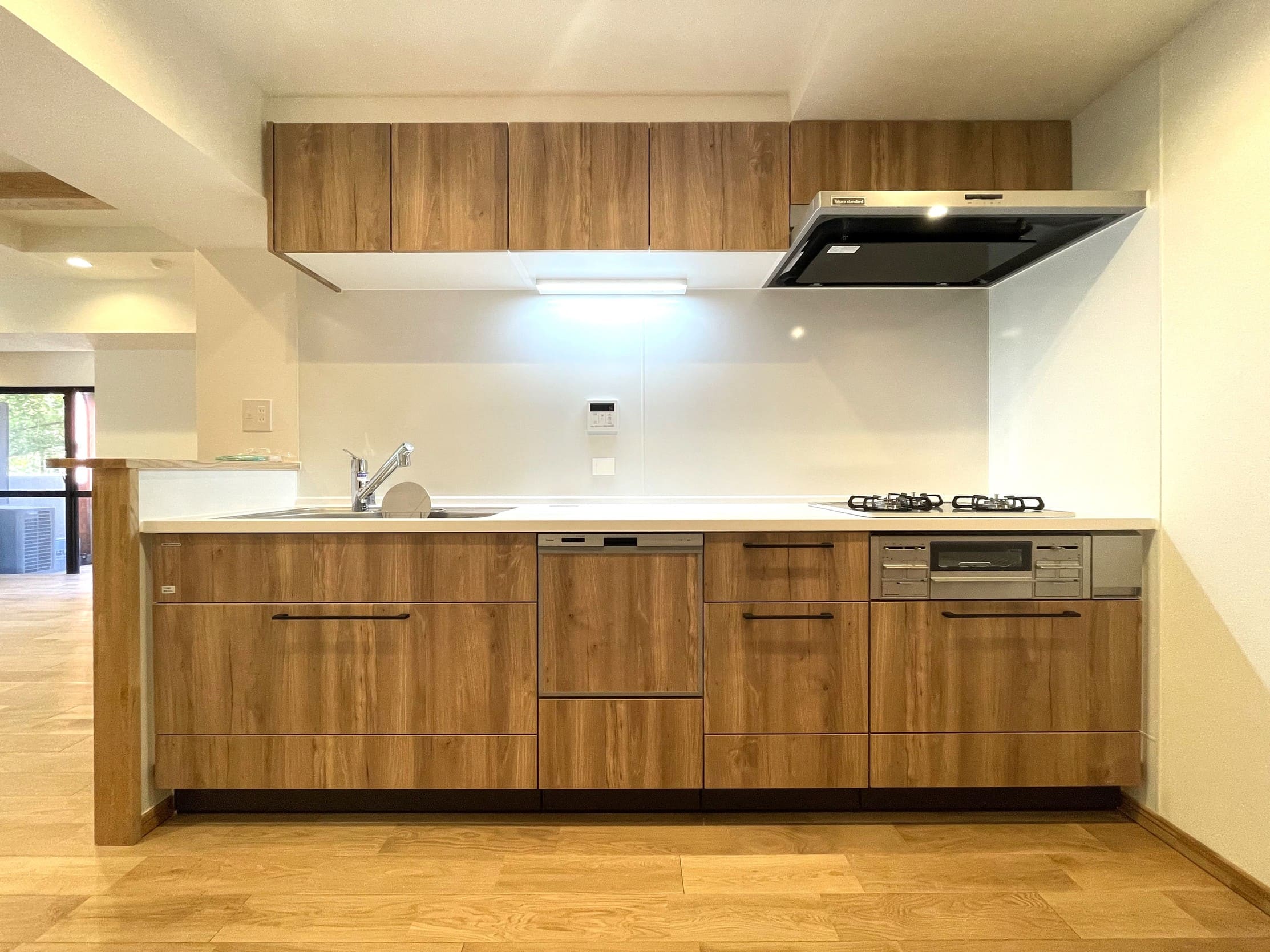 ウッドデザインのキッチンは、お部屋の雰囲気にマッチしていて、まるで家具のようです。3口コンロ、グリル、食洗機付きと設備面も充実しています。シンクも広々としているので野菜などが洗いやすそうですよ。