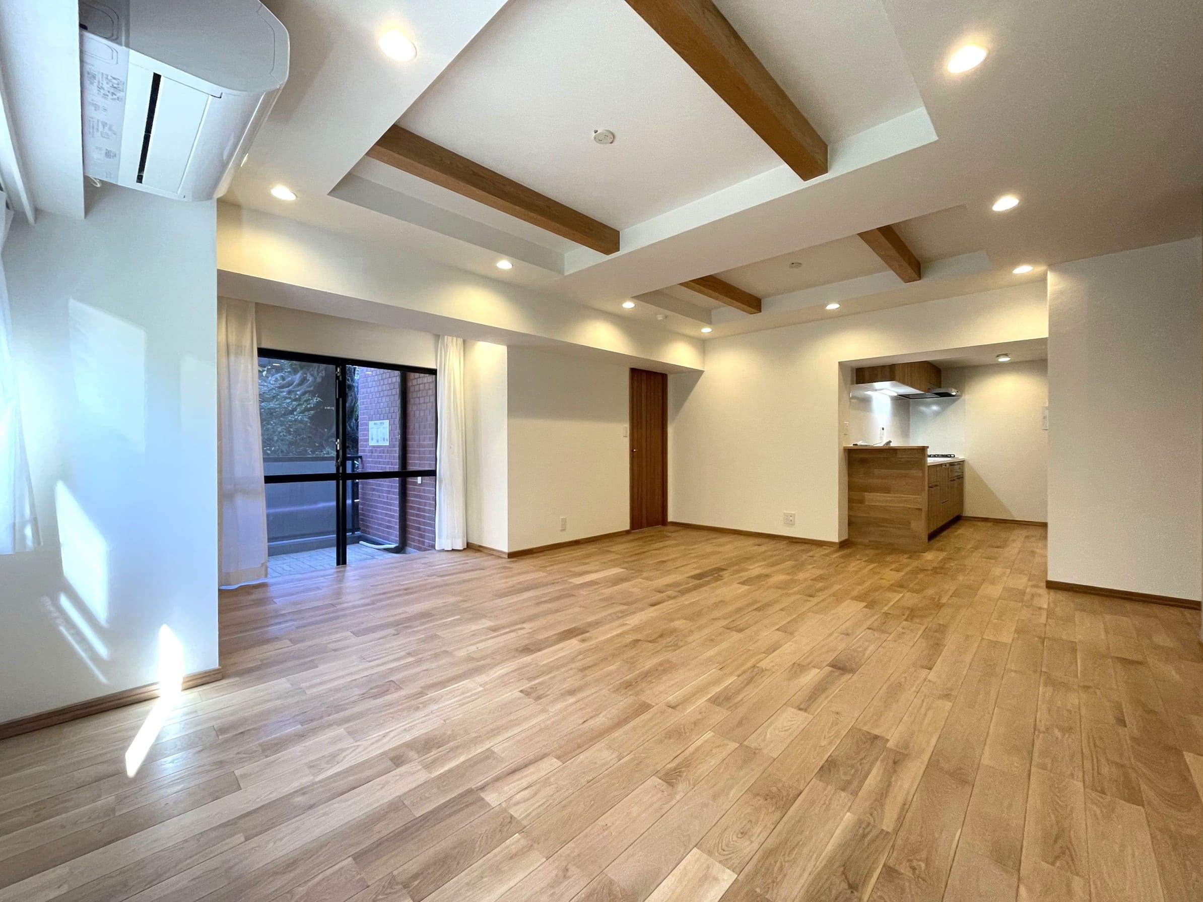 約21.4帖の広々としたリビングダイニングキッチンです。折り上げ天井+ダウンライトの組み合わせが印象的。天井にリズムが生まれ、奥行きと広がりを感じさせます。二面採光のため日当たり・通風が良好です。