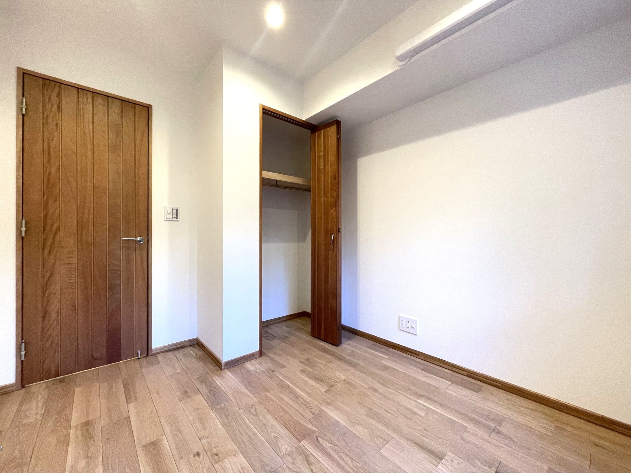 約7.5帖の洋室1は、ゆとりがあって主寝室に良さそうなお部屋です。大きめのベッドなども配置できそうですよ。また、コの字型にパイプハンガーと棚板が設置してあるウォークインクローゼット付きのため、荷物もすっきりと収納可能。