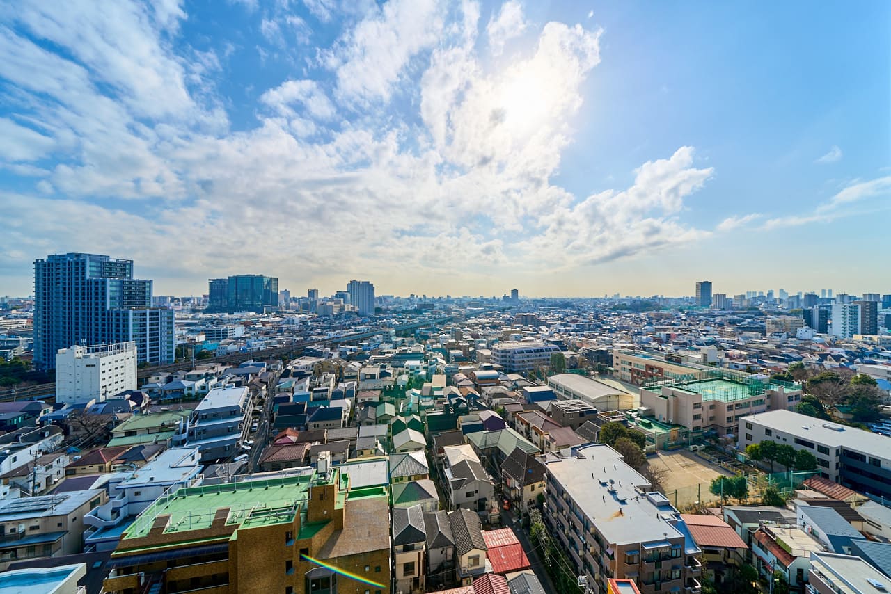 15階部分ということもあり、バルコニーや窓からは開放感溢れる眺望が広がっています。品川方面が望め、空の面積が大きく、雲の表情まで楽しめる眺望。住宅地の屋根が連なる風景は、夜も過度にギラつかず、長く住むほど心地よさを実感できるタイプです。