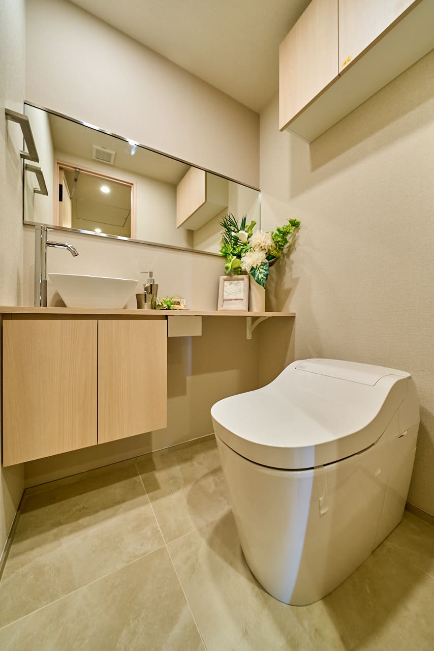 ウォシュレット一体型のトイレです。タンクレスタイプなのですっきりとした印象に。また、別途で手洗い器と鏡が造られているので、その場でサッと身だしなみを整えることができます。上部には吊戸棚が設置されていて、収納スペースもありますよ。カウンタースペースにはアロマなどを置いても◎。