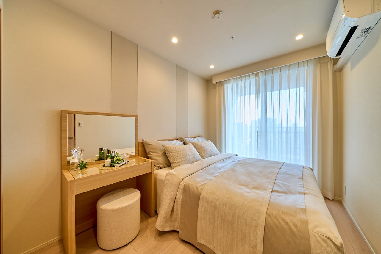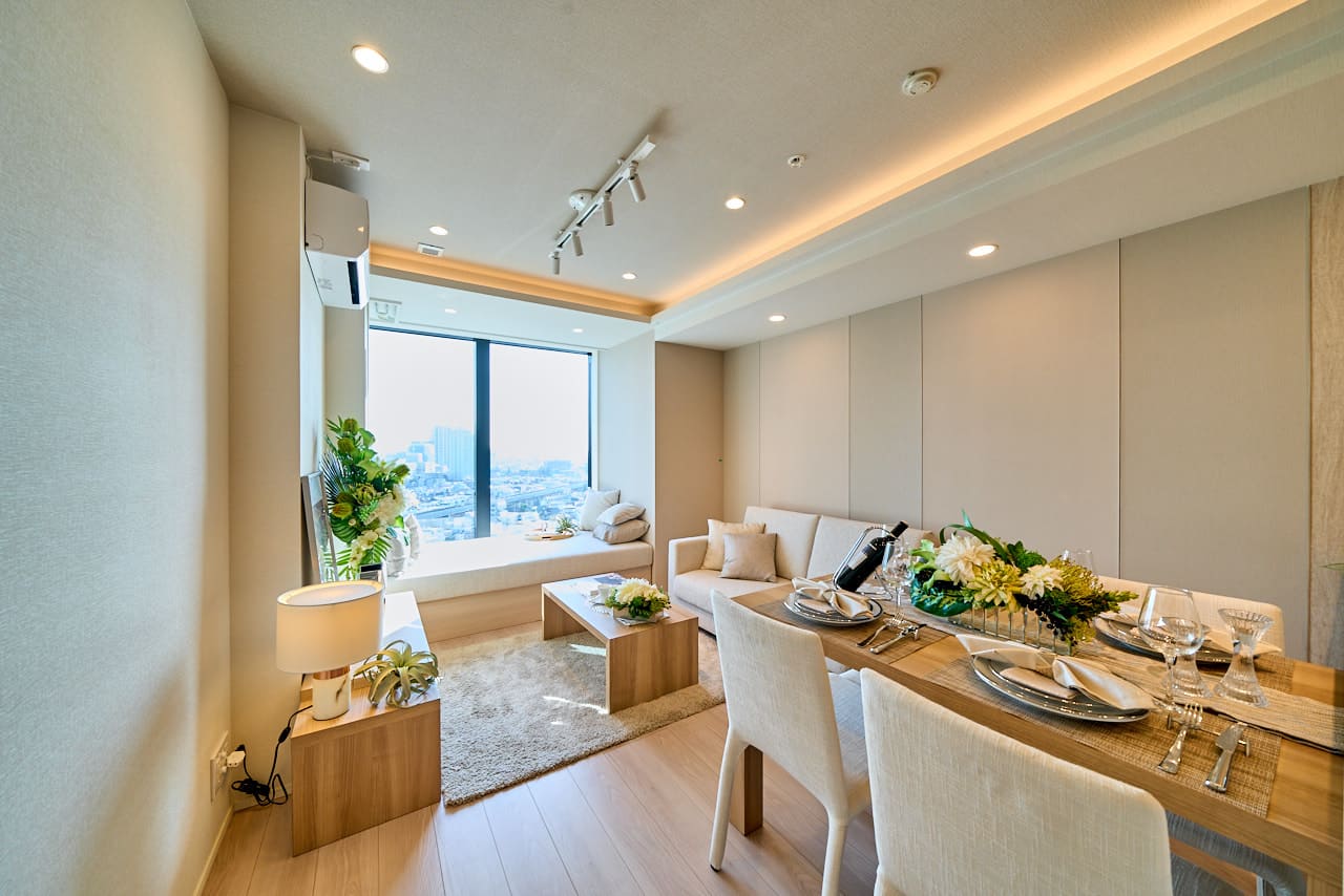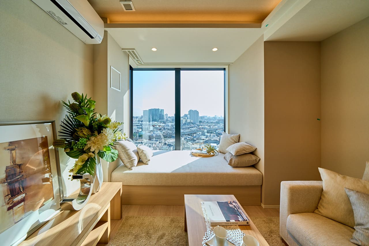 南向きで日当たりが良好。大きく造られた窓からは、開放感溢れる眺望が広がっていますよ。また、その手前にはソファベッドが設置されています。読書やお昼寝などが楽しめ、日々の癒しスペースとなってくれそうです。