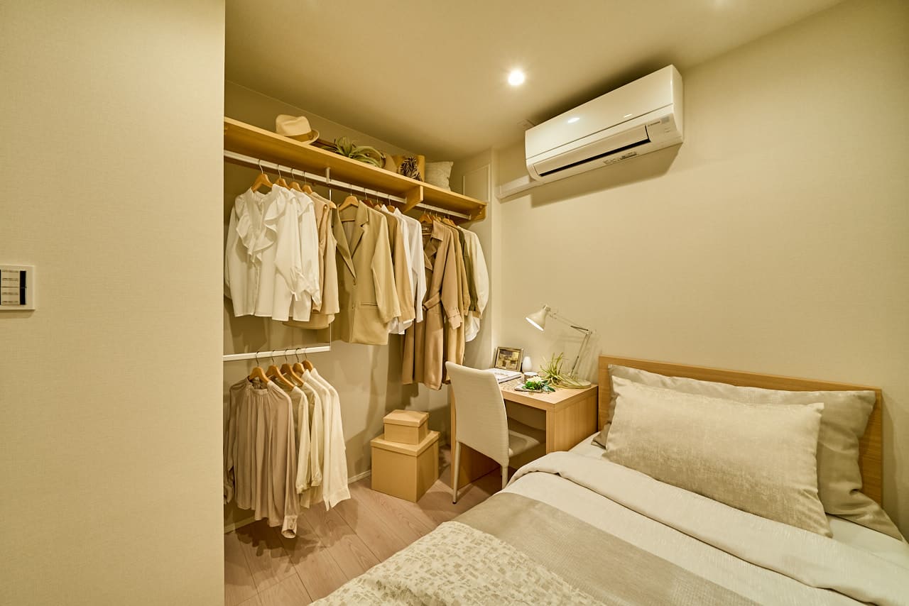 廊下側にあるサービスルームです。コンパクトなお部屋ですが、オープンクローゼットが設置されているので、お部屋に圧迫感を与えずに収納スペースを確保することができます。物事に集中できそうな環境なので、書斎やリモートワークなどにもぴったりです。